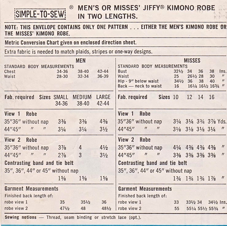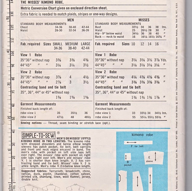 I know it says it is a man’s pattern, but way back in 1973 ‘his’ and ‘hers’ was all the rage. Today, we are far more relaxed about fashion and this would make a lovely, snuggly, kimono for a woman too, either for just stepping out of the bath or for a cosy night in watching a film or reading a book.