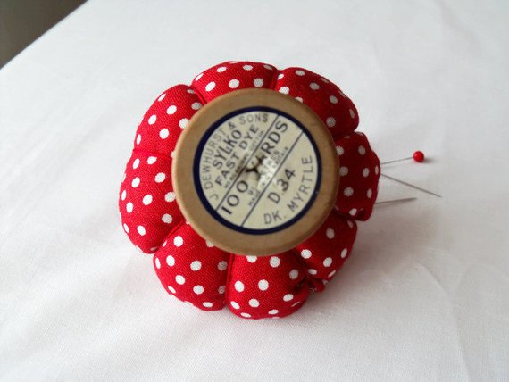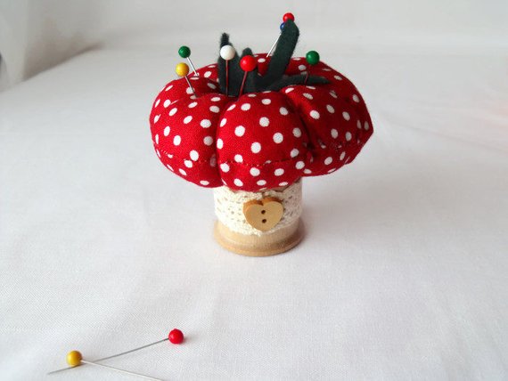 Here we have a plush tomato pin cushion on a vintage sylko wooden bobbin.