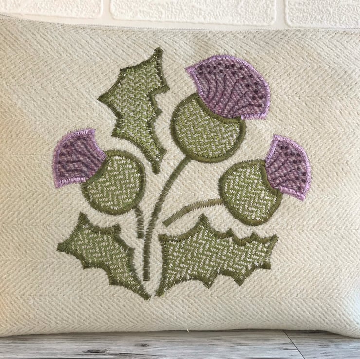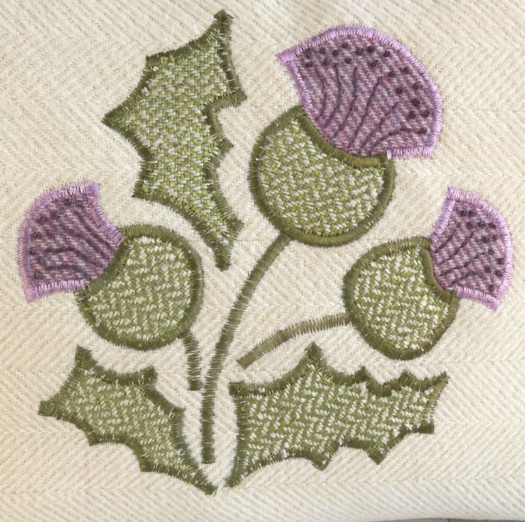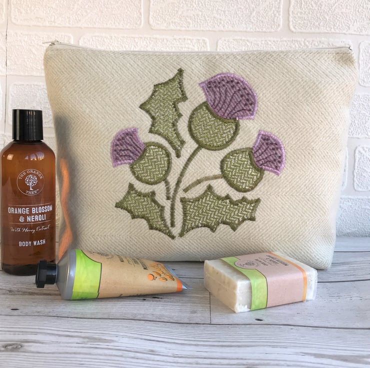 A toiletry bag in rustic cream fabric with a herringbone pattern in the weave. The wash bag features an appliqué design depicting thistles. The thistle leaves and bases of the flowers are made from green fabric with a zigzag pattern in the weave. The flowers are made from lovely dusky pink and lilac tweed. I've used hand embroidered backstitch and French knots to add detail to the flowers. The stems are machine embroidered in satin stitch.