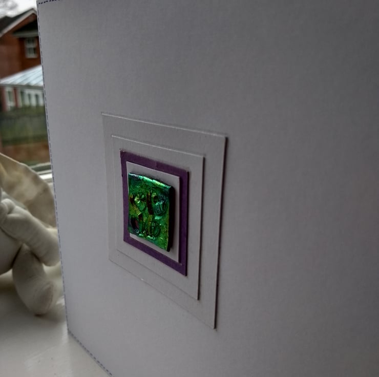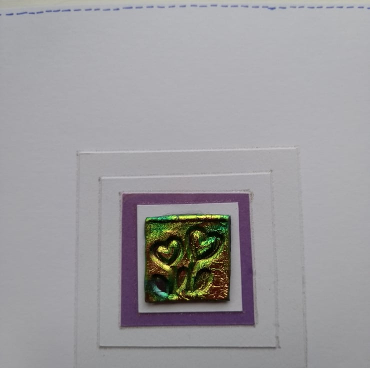 A completely handmade and uniquely designed card. Consisting of a square of holographic meldable plastic which had been embossed with two heart flowers. Mounted on to purple then 2 layers of white and finally onto pristine white quality card. Silver highlights.