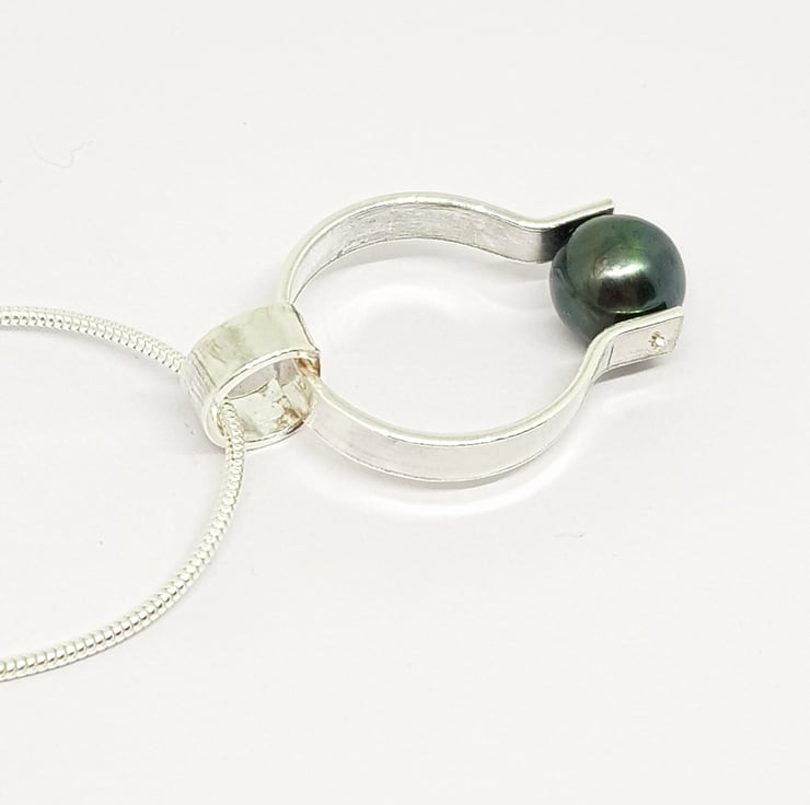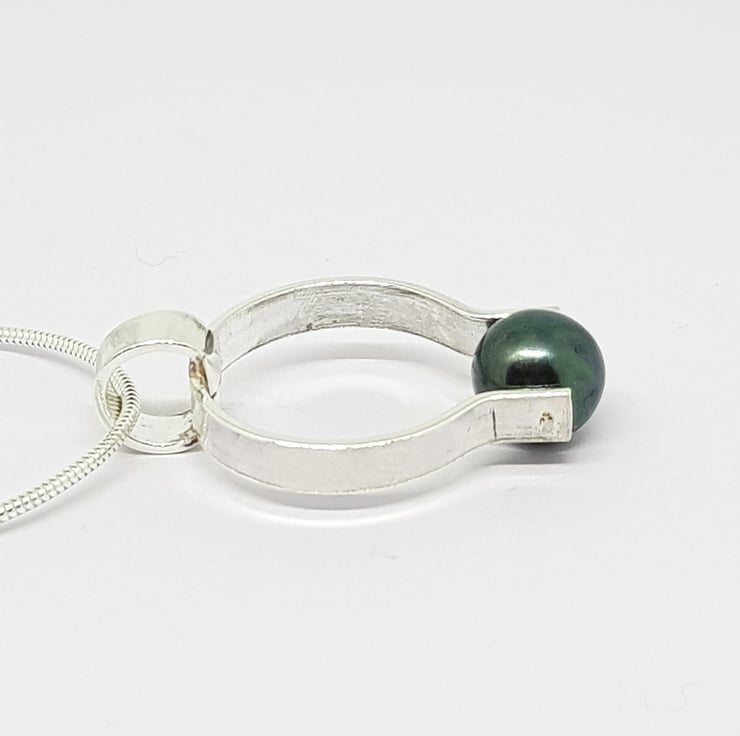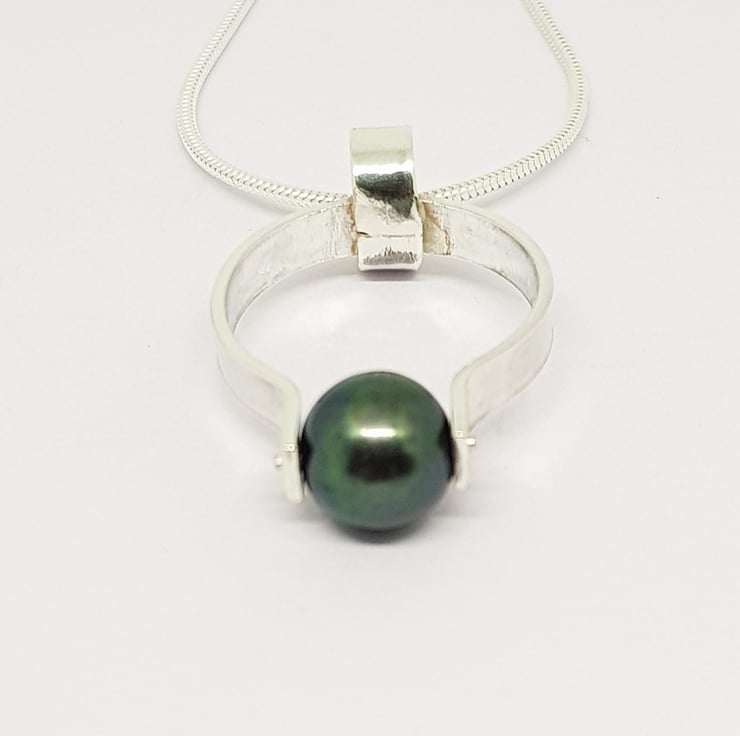 Made using 4 x 1 mm rectangular wire and a drilled cultured pearl which is riveted into the silver frame.