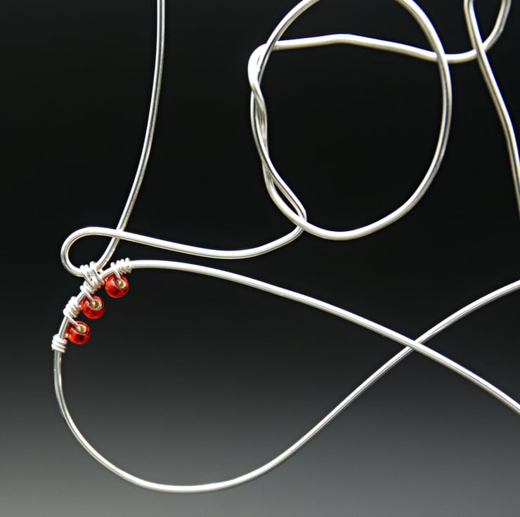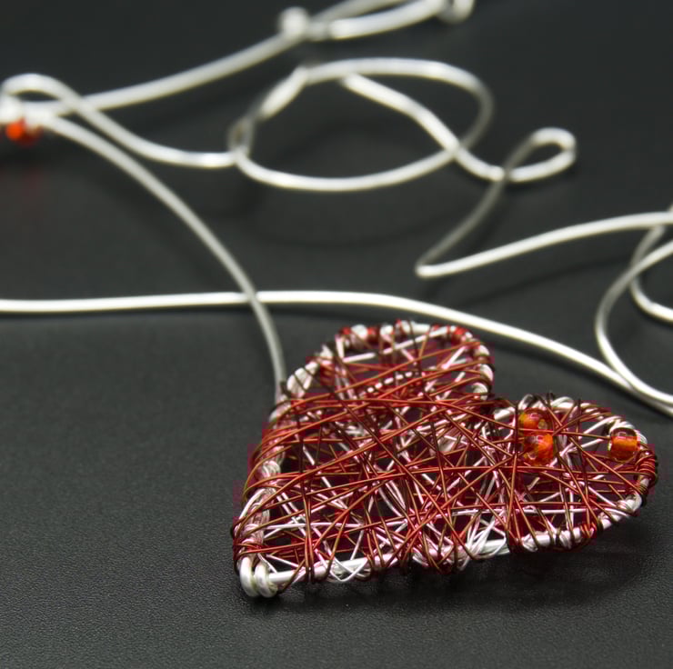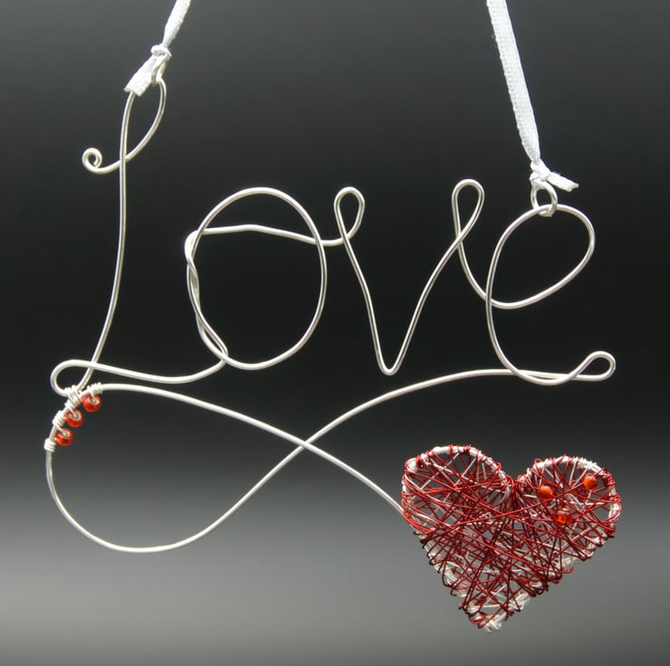 This sweet little wire decoration features the word 'Love' written with a single length of silver plated copper wire. I've used the tail end to form a loop & heart shape, which I have wrapped with very fine silver & then red wire & some little red seed beads. Three more beads are wrapped to the inside of the loop to secure it to the 'L'.