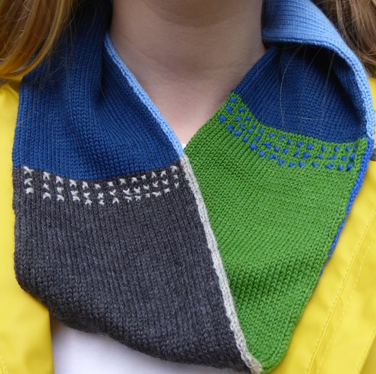 Wool Knit Colour Block Infinity Scarf, created on my knitting machine using 4ply 75% wool, 25% Acrylic yarn. I have added hand embroidered cross stitch details using wool yarn. Can be worn with either side facing the outside.
