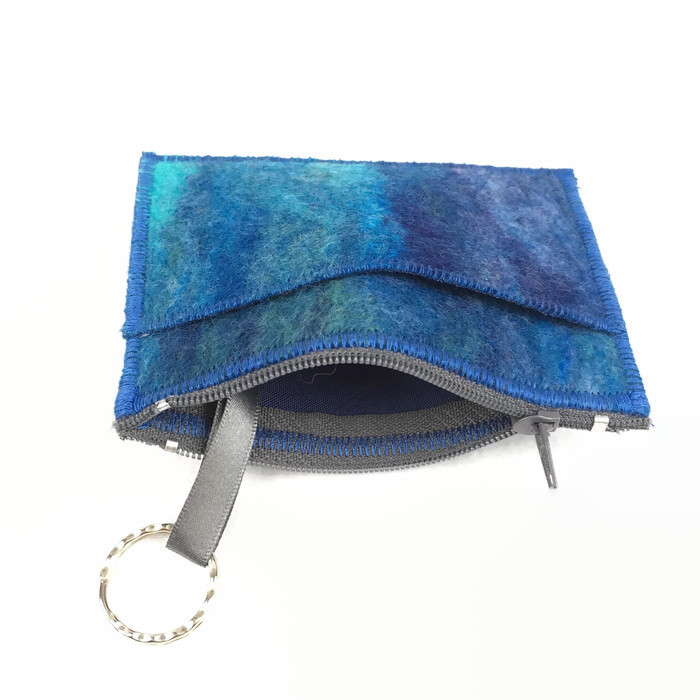 This purse has been made using a piece of hand made felt. The felt is made from several fine layers of a blend of blue woollen fibres that have been wet felted. The purse is sewn together with overstitched seams to create a flat style purse without bulky seams. An additional pocket has been added to one side and an integral keyring is attached to the inside with a loop of grey ribbon. A dark blue fabric has been used to line the purse and a grey zip closure added.