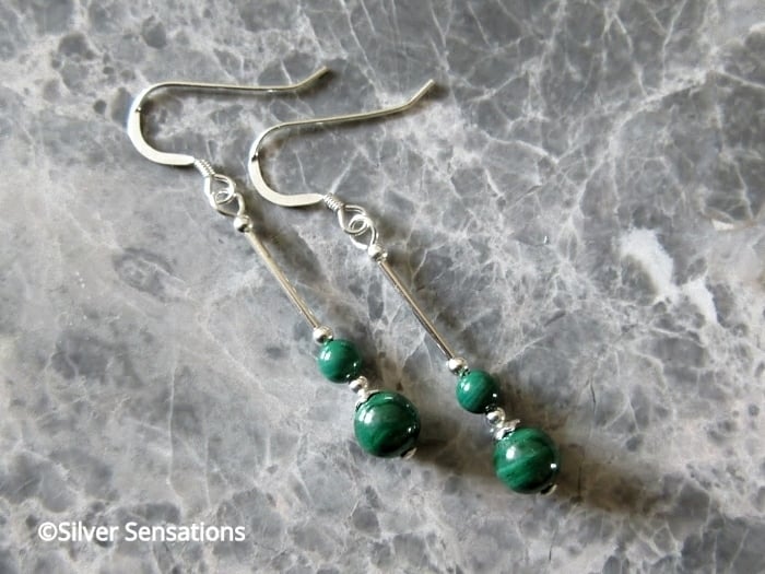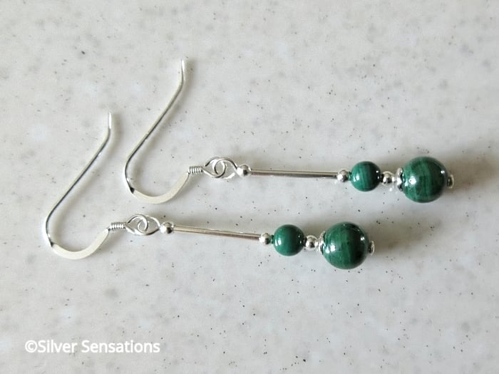 These handmade ladies green earrings have genuine Malachite round beads & Sterling Silver.