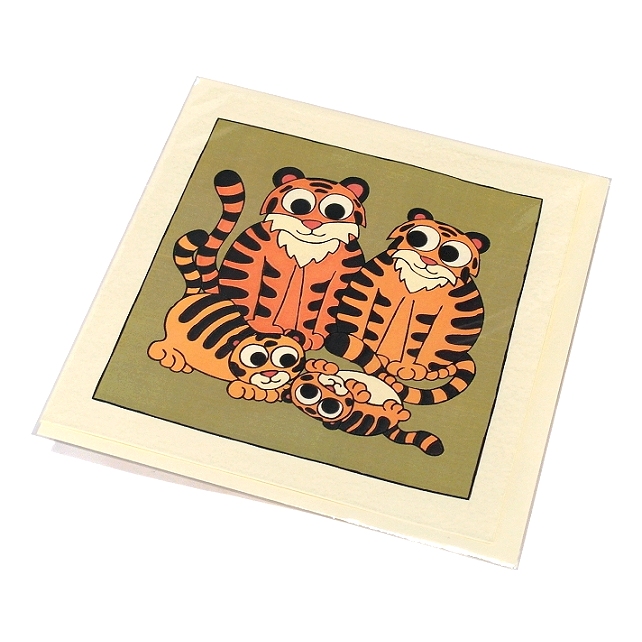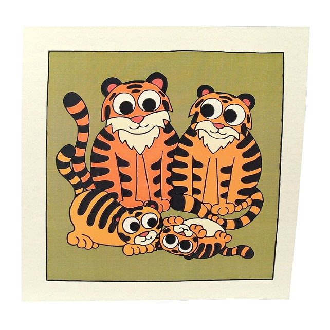 This original cute tiger design by Kim Onyskiw is printed on a 15cm x 15cm (6" x 6") square ivory card, and comes with an ivory envelope. The inside of the card is blank for your own message, so it could be suitable for a number of occasions, such as a new baby added to a family or as a father's day or birthday card for a tiger lover.