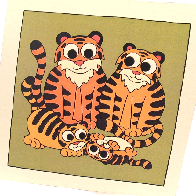 A cartoon mother and father tiger are watching over their 2 cubs, which are rolling over and playing on a green background.