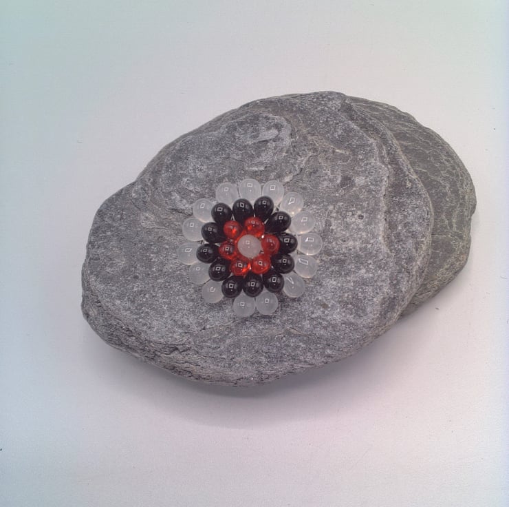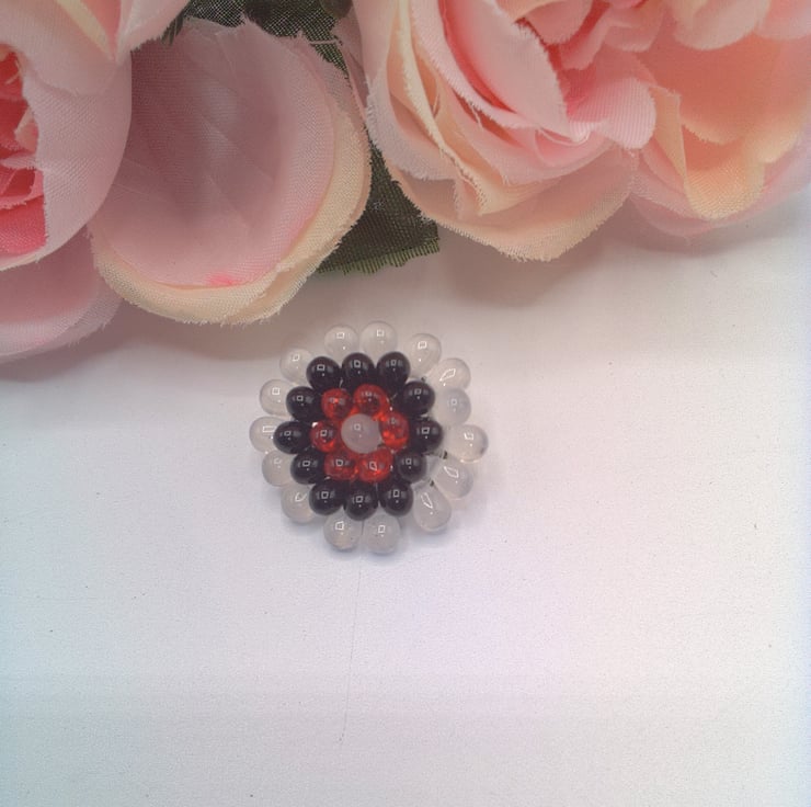 This pretty hand sewn mandala brooch would look great with any of your Spring or Summer outfits for everyday or for an evening out. It would also make a great gift for someone special, or treat for yourself. The brooch is made by sewing small 6 mm red, white and black duo beads to form the mandala and then attaching it to the silver plated brooch back. The brooch is approx. 30 mm across. If you require any other colour combination for your brooch then please contact me by sending me a message to discuss further. The brooch will be dispatched wrapped in tissue paper in an organza bag and delivered to you via Royal Mail first class post.