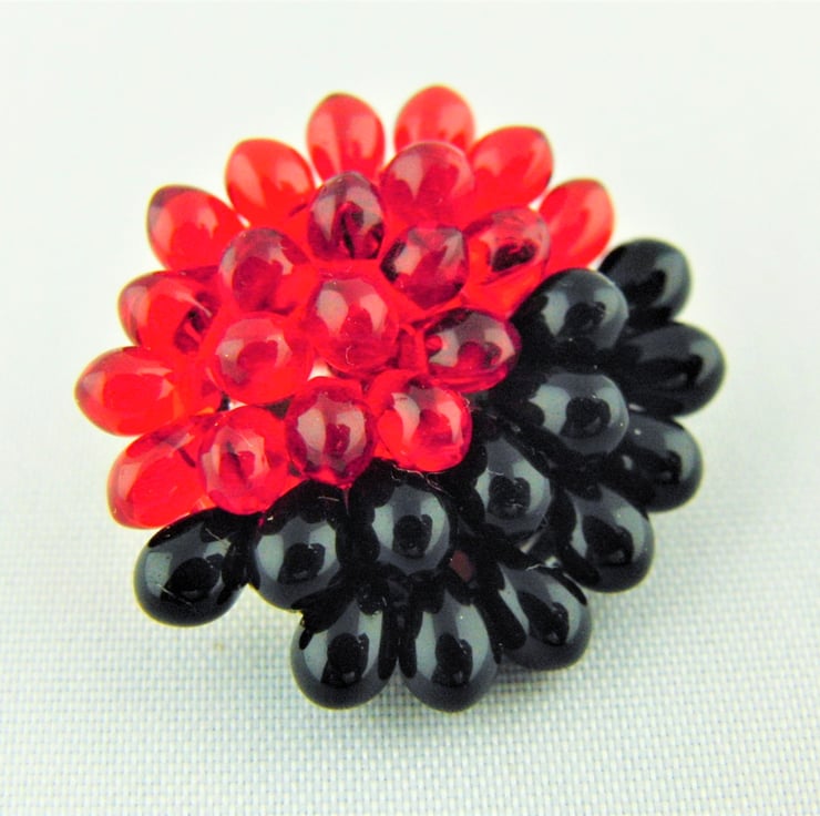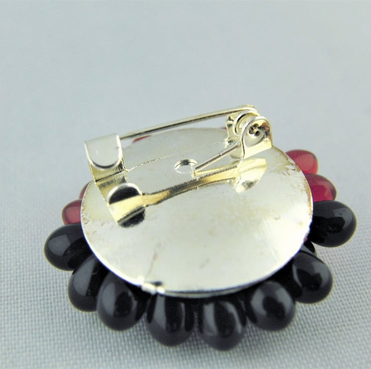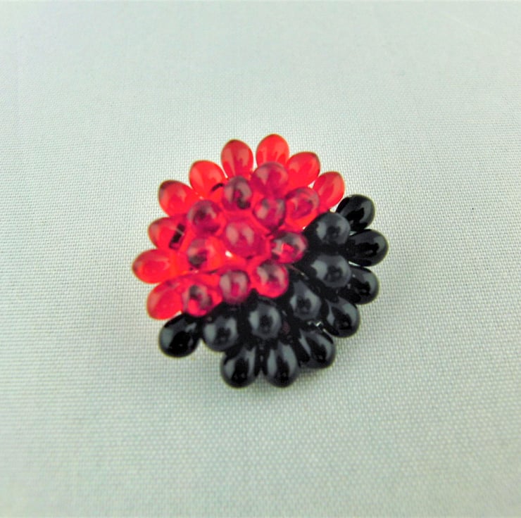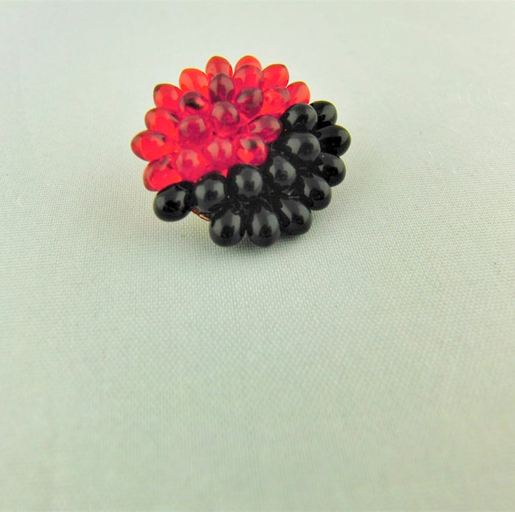 Unusual hand sewn beaded brooch made by sewing small red and black tear drop beads to the silver plated brooch back. The brooch is approx. 30 mm across.