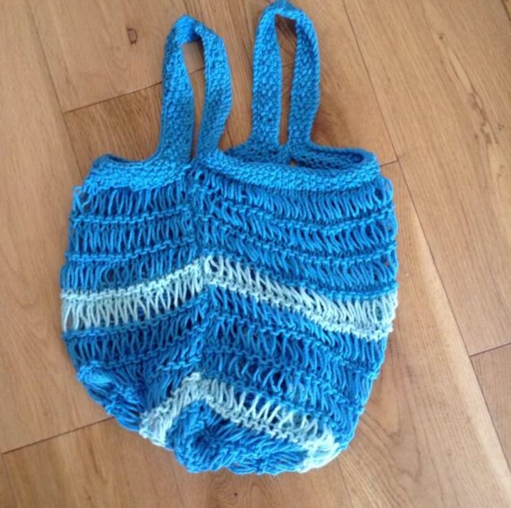 Hand knit market bag in 2 shades of blue. Made in strong American sugar n cream cotton. Stretches to accommodate your shopping. Unlined.