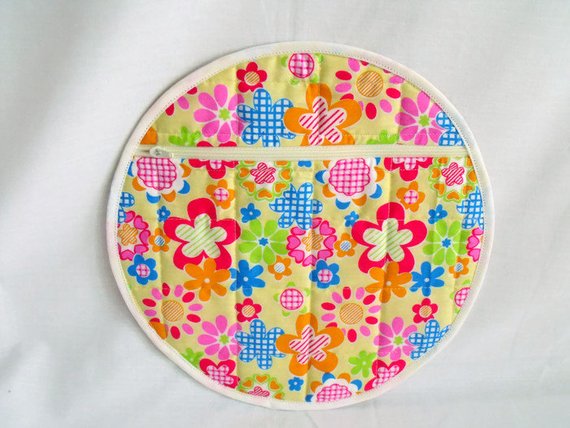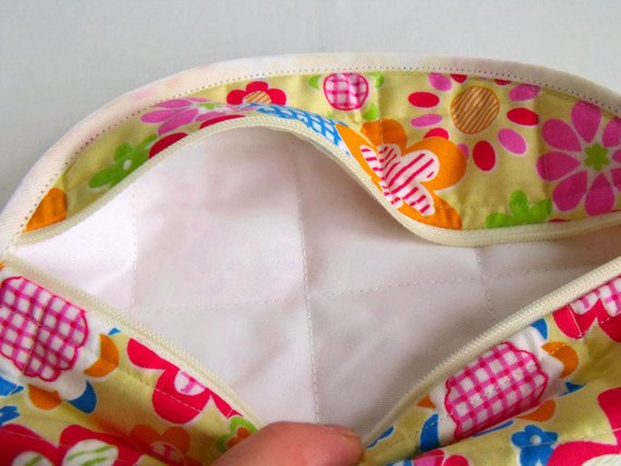 Sewn with multi coloured floral print on a lemon background, the fabric is the same front and back.