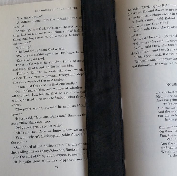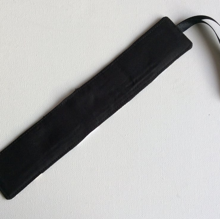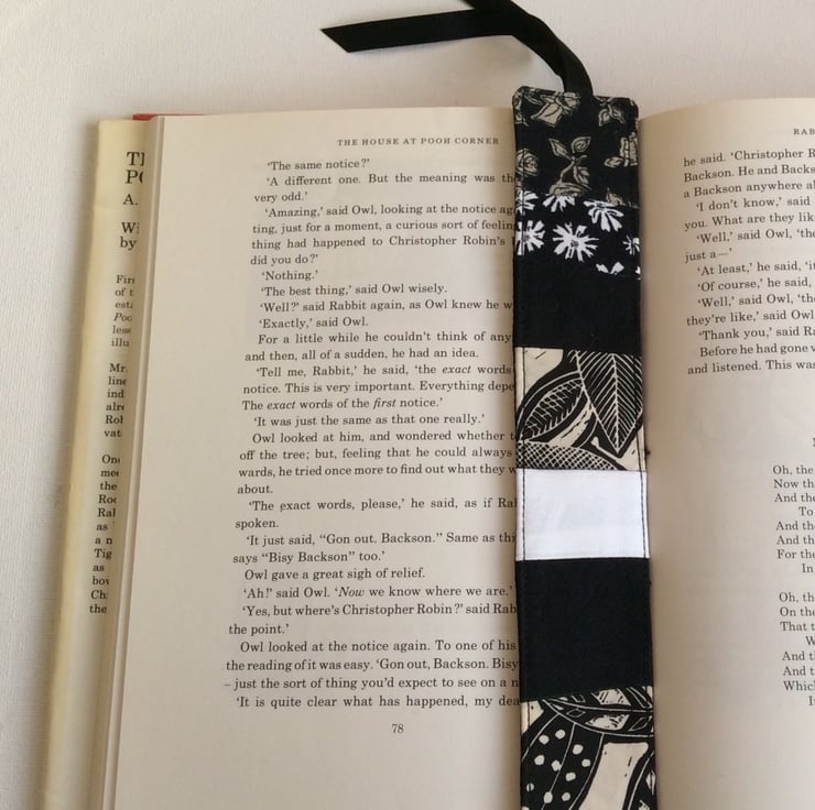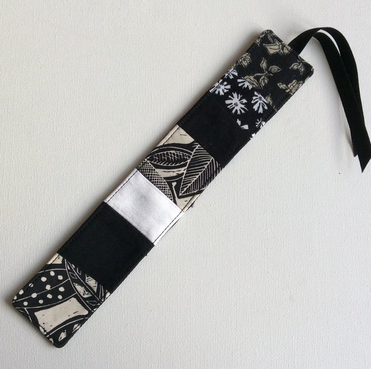 This bookmark is made from a patchwork of black and white fabrics.The back of the bookmark is black China silk and there is a double black satin ribbon. The bookmark measures approximately 23cm x 4cm.