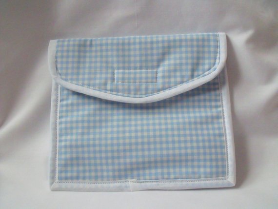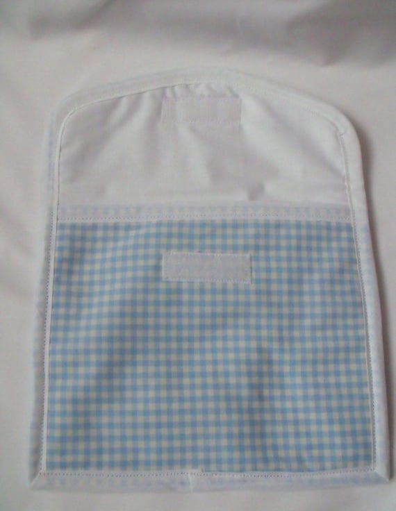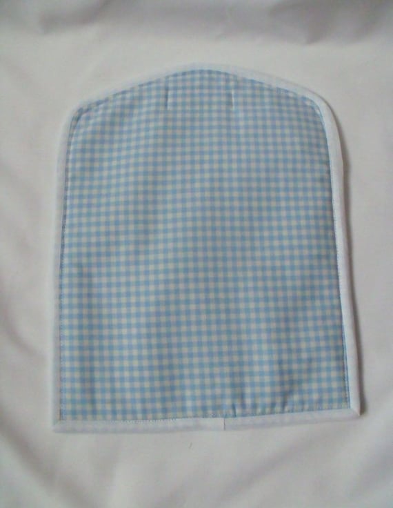 Sewn with blue gingham cotton with felt sandwiched between a white lining fabric.