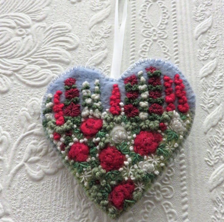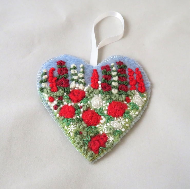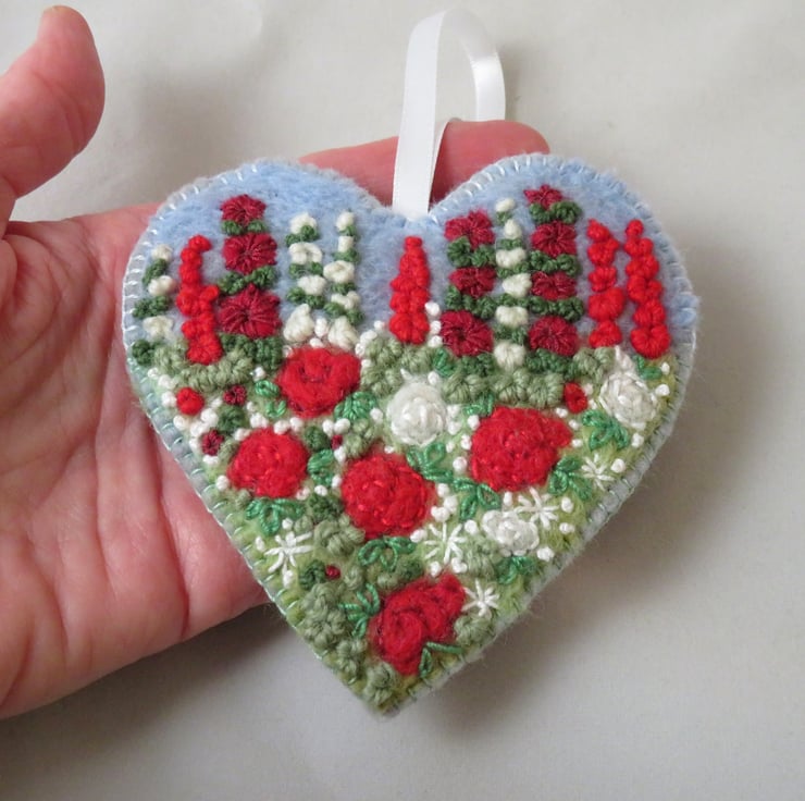 Green and sky blue, hand-dyed wool fibres were felted to a heart shape cut from 'eco' felt (commercially produced from recycled plastic bottles), using an embellisher machine. Red and white rose shapes, and spires of red hollyhocks were needle felted to the background. These large blooms were enhanced with hand embroidery. A rich texture of stitched flowers was created by the addition of smaller blooms, and foliage, hand embroidered in various wools and threads.
