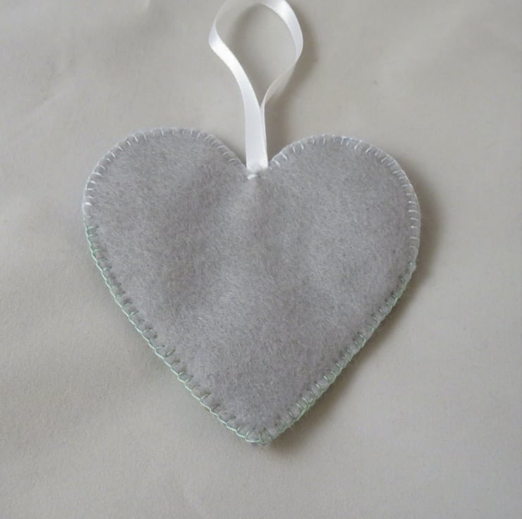 A white ribbon loop has been added for hanging. The back of the heart has been neatened by a second layer of 'eco' felt - blanket stitched to the front using green and pale blue cotton threads to correspond with the blue and green areas in the stitched design.