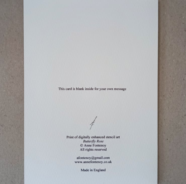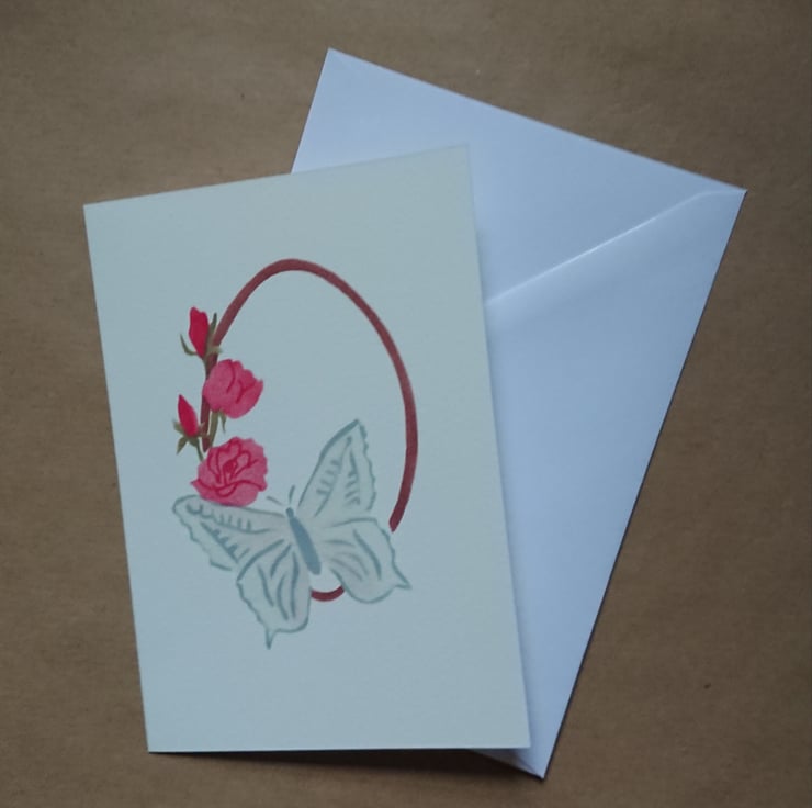 Butterfly Rose card featuring a butterfly and red roses entwined around an oval surround was made from my pencil sketches. I then made hand cut stencils from them, and airbrushed the image onto fine art card. I have scanned the handmade card and lightly touched it up with photo editing software. I now print these cards with Epson Claria inks with an A4 desktop inkjet printer onto English watercolour card, a 190 gsm digital fine art paper, lightly textured, medium weight card.