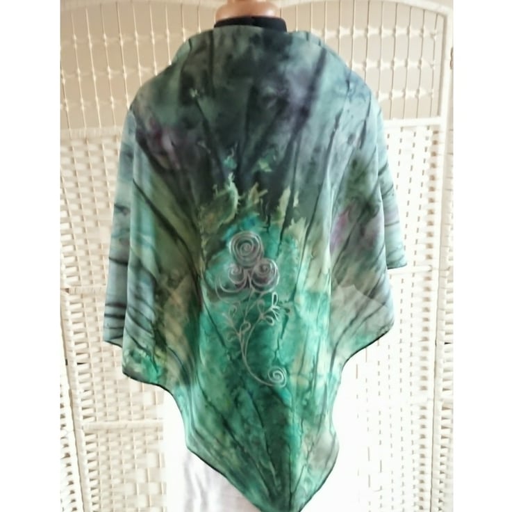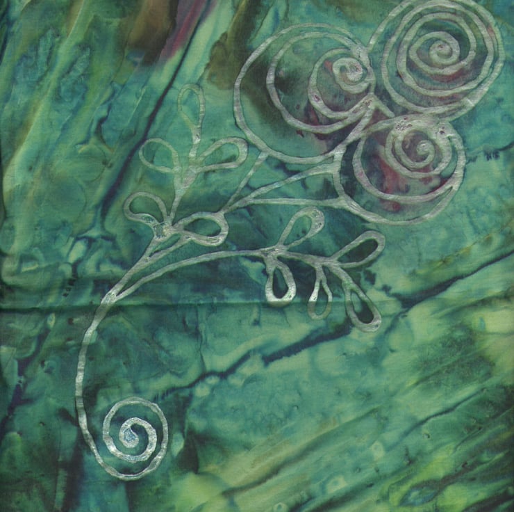 The bunch of silver roses are hand painted onto the handmade silk scarf on a background of various greens which I painted with fluid silk paints in various hues of green and red which have merged into each other. The edges of the green silk scarf are hemmed with hand stitches to make a flat stitched hem. The scarf is made from 100% silk habotai.