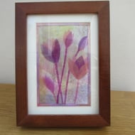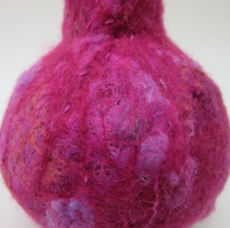 This small glass vase is covered with handmade magenta pink felt. Merino wool has been used for the hand felting method and pink and mauve silk slub fibers have also been felted into the surface to give a raised bubbly appearance. A few small hand stitches echo the felted design. The colour is dark raspberry pink, mauve and a lighter shade of pink