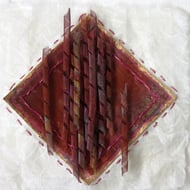 This small glass vase is covered with handmade magenta pink felt. Merino wool has been used for the hand felting method and pink and mauve silk slub fibers have also been felted into the surface to give a raised bubbly appearance. A few small hand stitches echo the felted design. The colour is dark raspberry pink, mauve and a lighter shade of pink