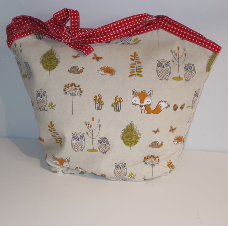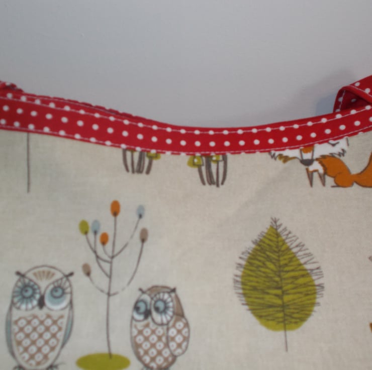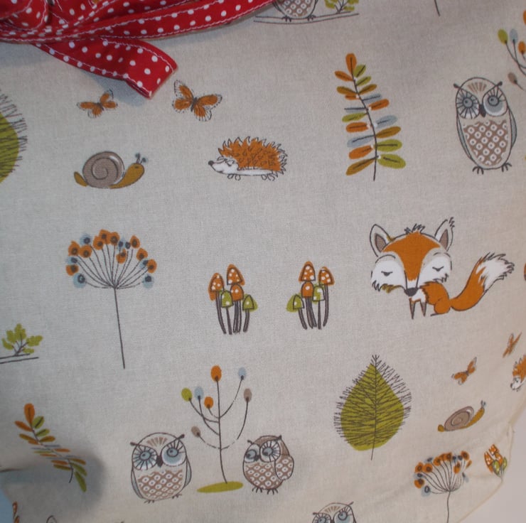 The Fabric is cotton and has a lovely print of woodland animals in a cartoon style. The animals include foxes, owls, hedgehogs, and snails.