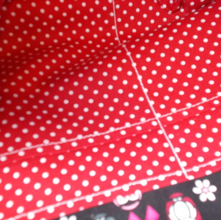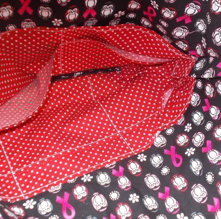 The background colour is pale brown. The lining is black a print with owls on it. It also has large pockets inside. The edge and handles are made in red with white spot bias binding.