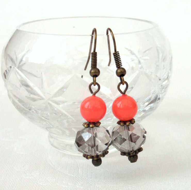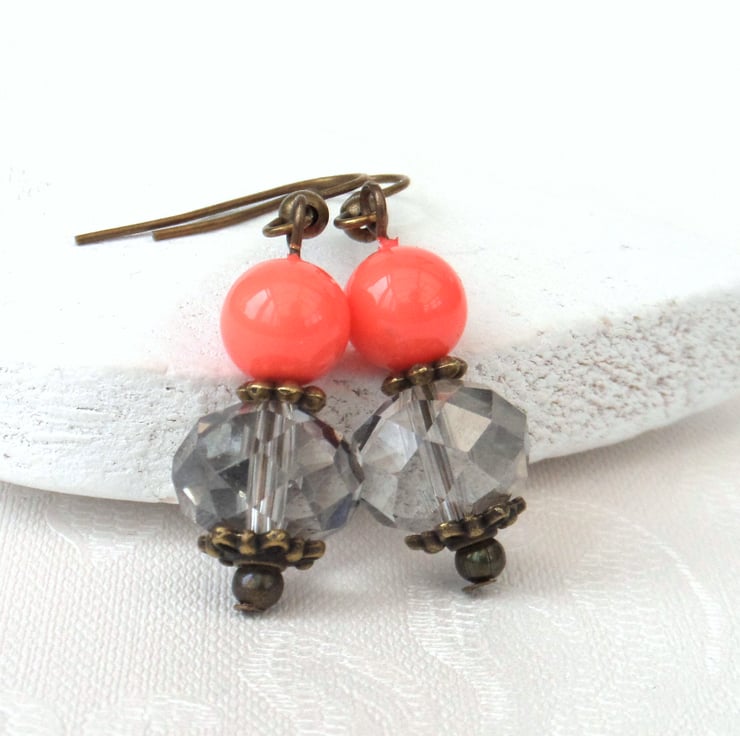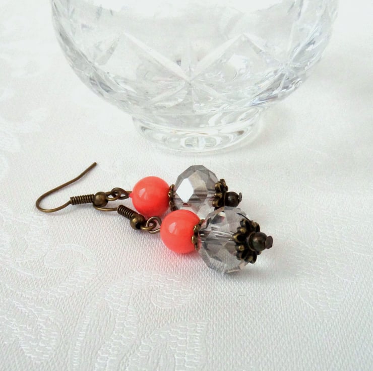 A unique pair of earrings, made with 'Living coral' jade and a 10 x 8 mm silver shadow crystal and bronze rondelle and round beads.