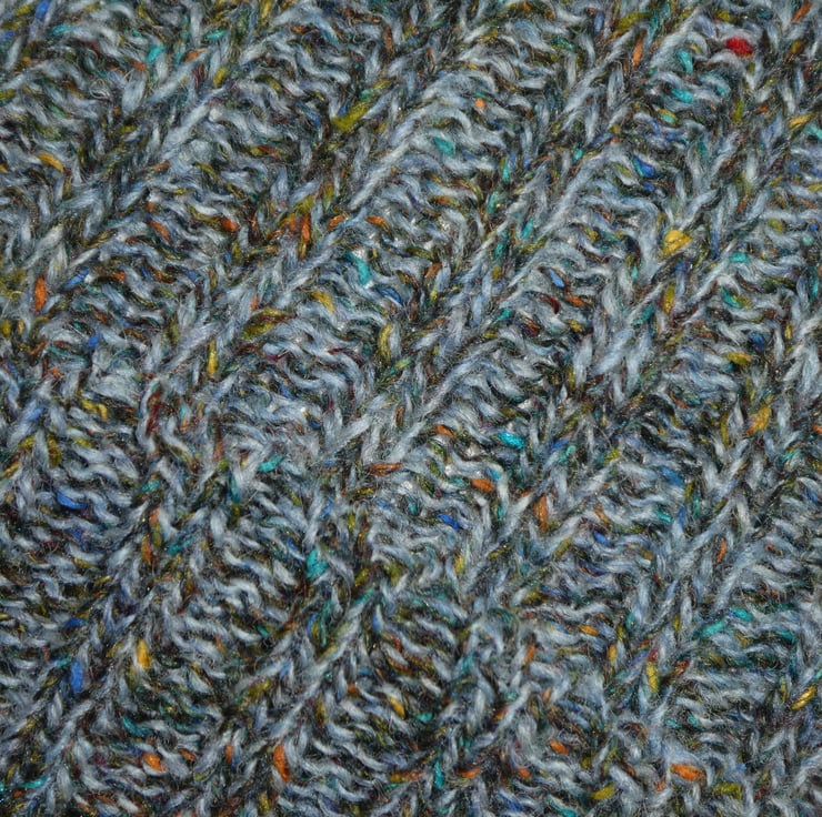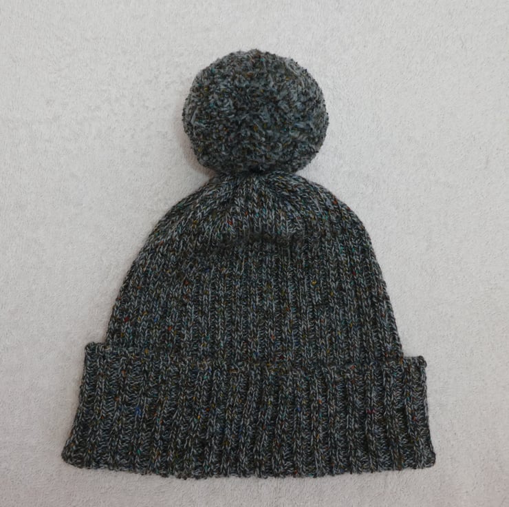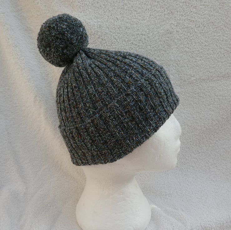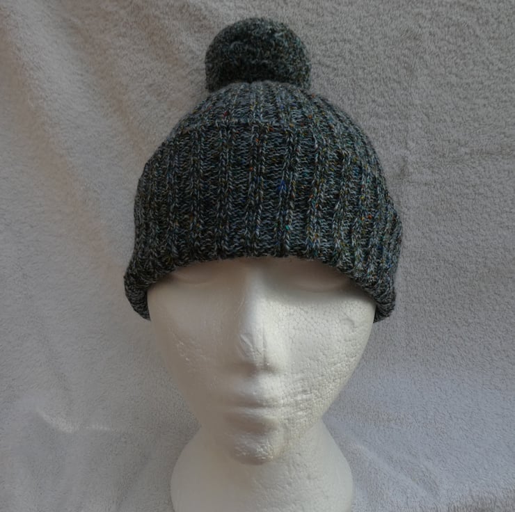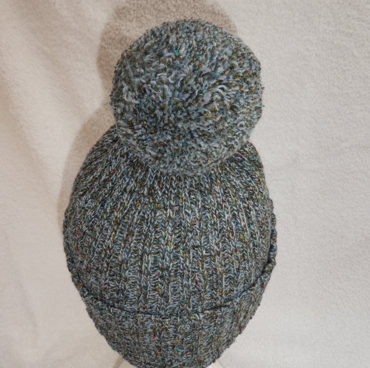 I have created this bobble hat on a knitting machine using a 2 x 2 rib stitch. The yarn is a lovely variegated blue tweed effect pure wool, and the hat has been gathered at the top, where the pompom is securely attached.