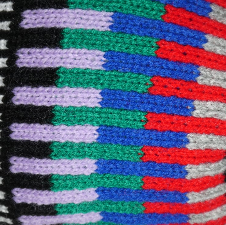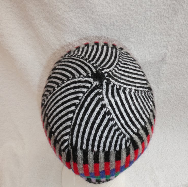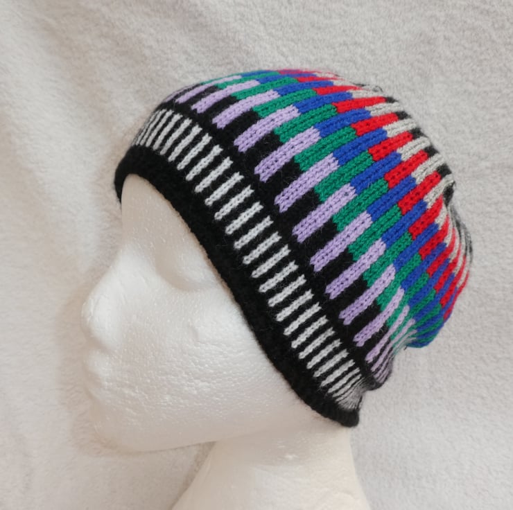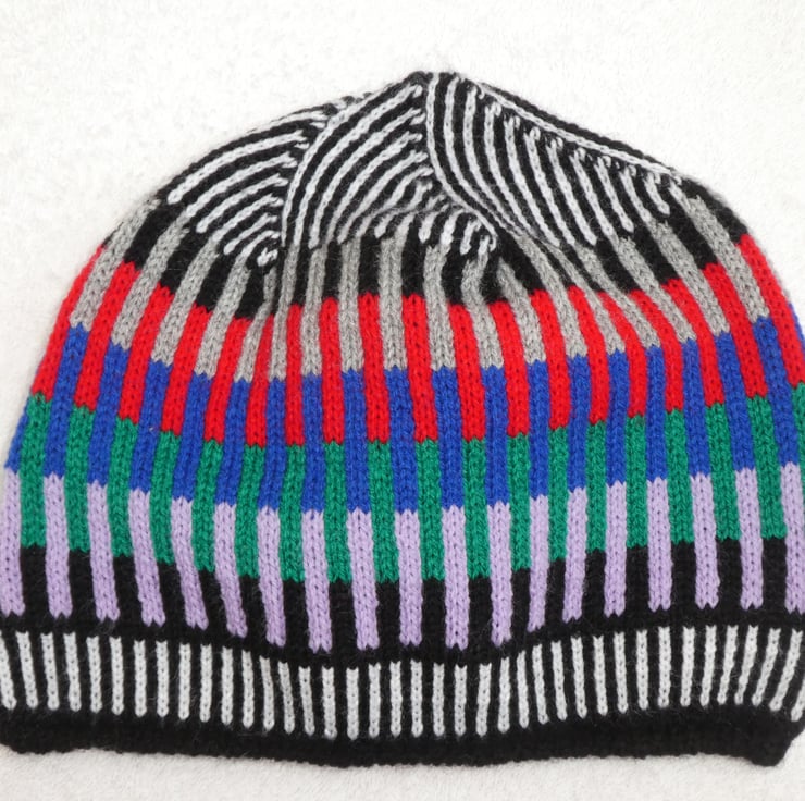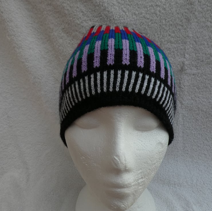 I have created this beanie style hat on my flat bed knitting machine.The hat has been knitted with acrylic 4 ply yarns in an all over pattern with bright colour changes.
