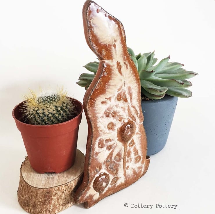 This delightful moon gazing hare is made from textured stoneware clay and decorated with pattern. It is cut from a hand drawn template. It is then fired once and decorated with stoneware glazes and re-fired to 1260 degrees making it nice and strong. It has a metal D ring hanging loop attached to back so that you can either hang it straight on the wall or tie a loop of ribbon/ string to it. Hare dimensions are 15 x 9cm x 0.6cm deep. Was £12 - now £6