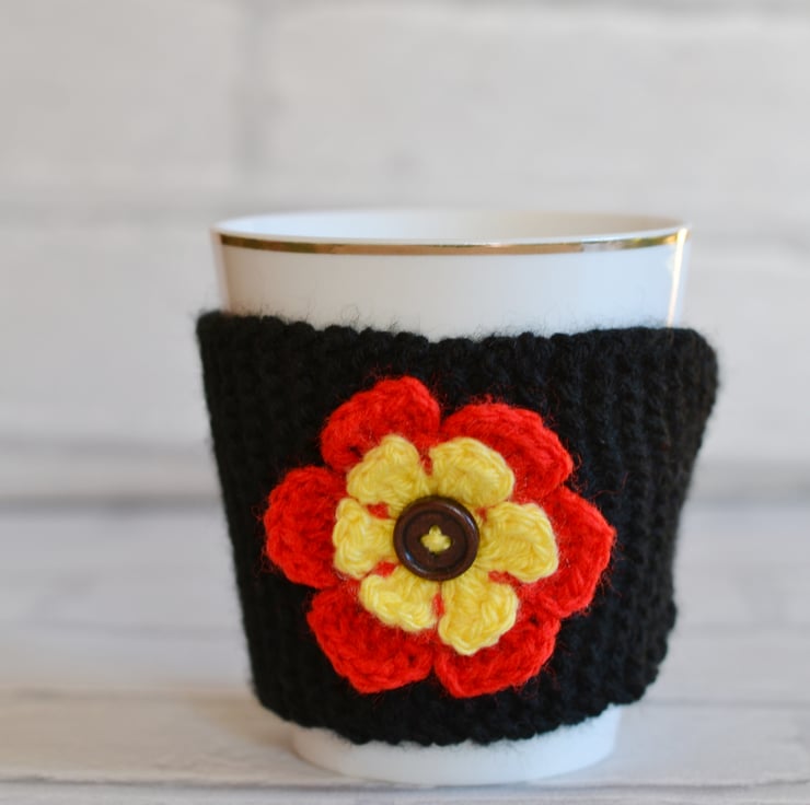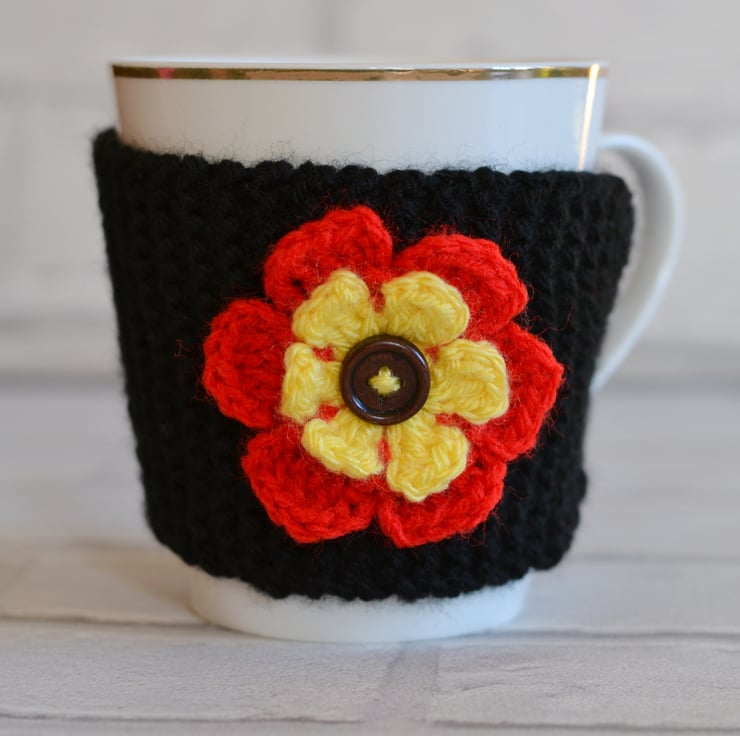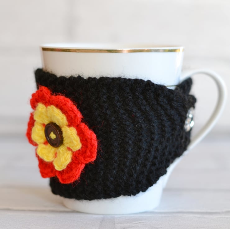 Knitted in garter stitch in 100% acrylic. Knitted in black with a bright red and yellow flower sewn onto the cozy. It fastens with a clear faceted button and fits standard size mugs and regular costa coffee cups. I have sewn a walnut wooden button in the centre of the flower. I can make this in other colours.