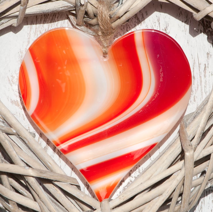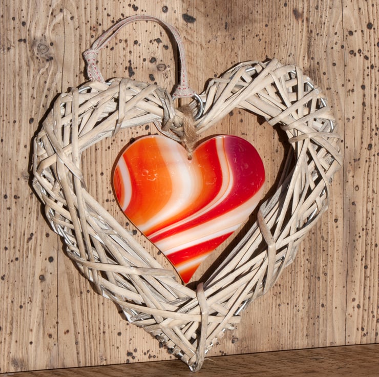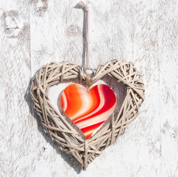This natural wicker heart has a beautiful piece of red/orange artglass, shaped into a heart, suspended in the middle and has been finished with a length of co-ordinating cotton ribbon with little red stitching.