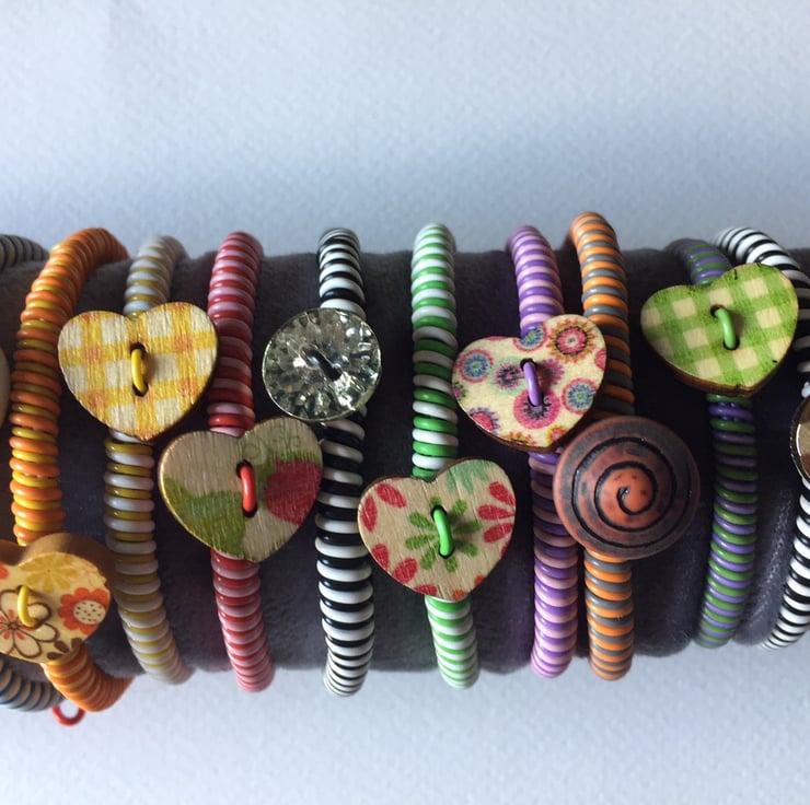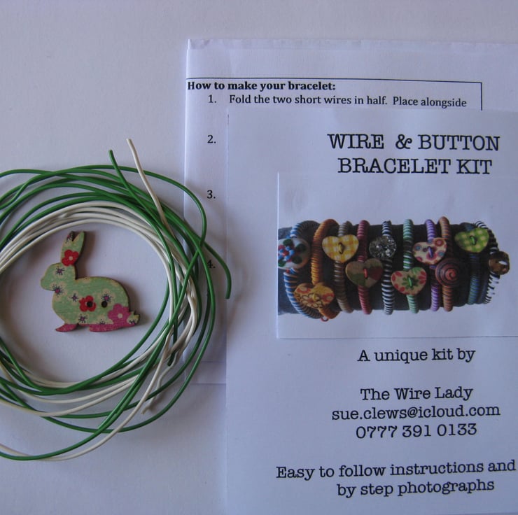 This unique kit designed by The Wire Lady makes a wire wrapped bracelet using plastic coated wires and a novelty button decoration. Fastened with an integral wire hook and loop, the bracelet can be adjusted to fit most sizes of adult and child wrists.