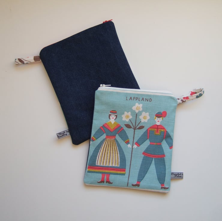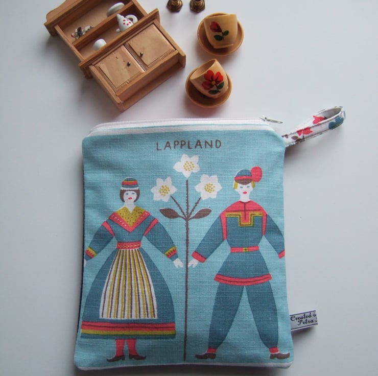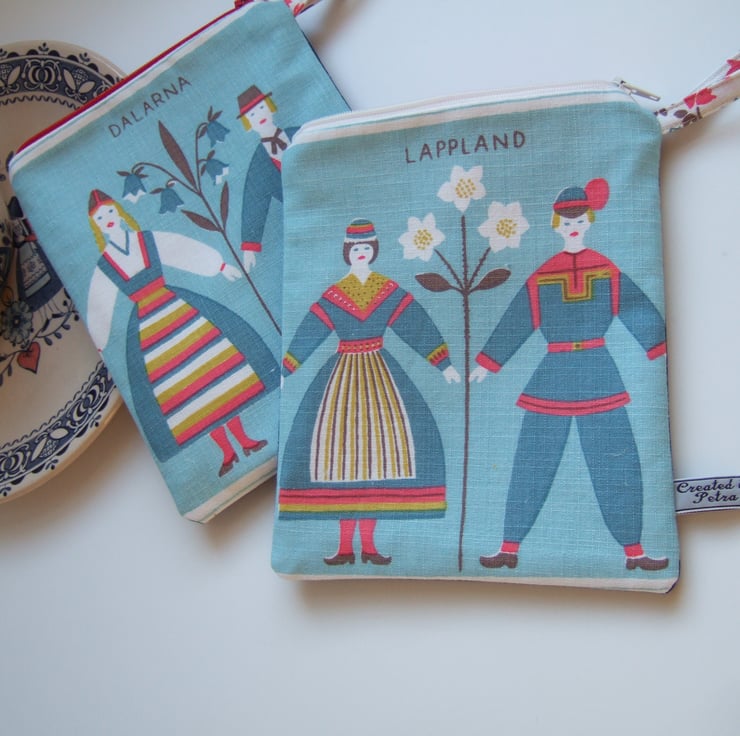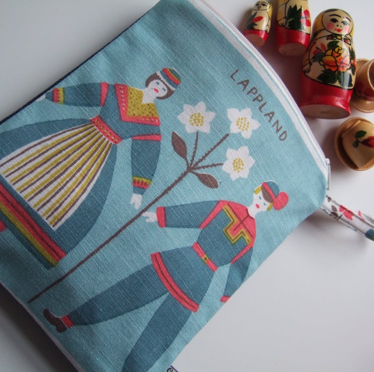 Here is a great zip up pouch or make up bag, with a sweet folk art design of a couple wearing regional dress from Lapland. Made from a softly faded vintage Swedish tablecloth, it has a lovely washed out palette, and would make a great gift for an admirer of mid century modern, Scandi or Swedish design.