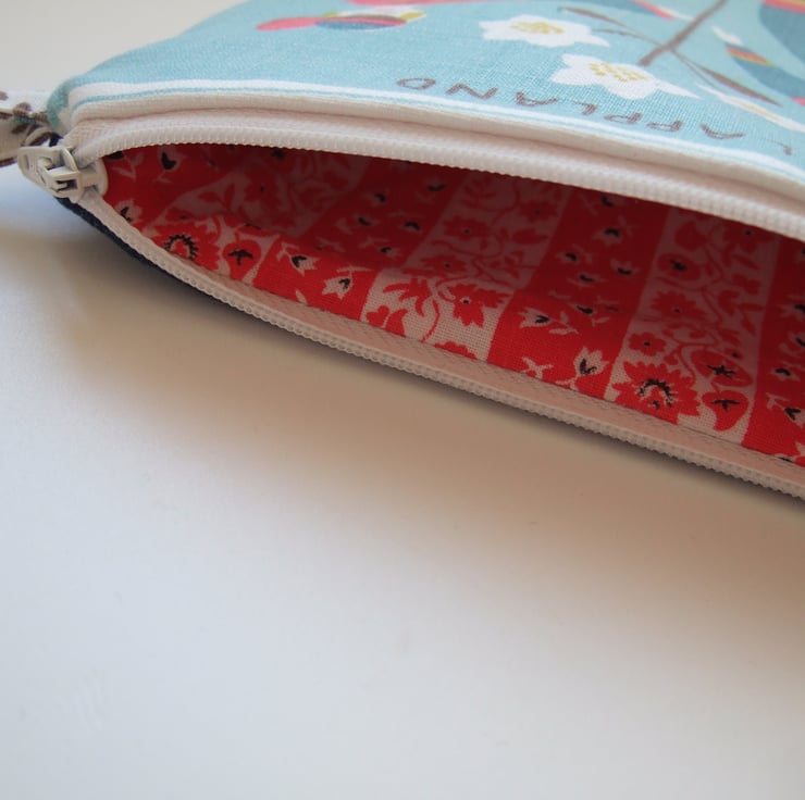 What a lovely find at a table top sale. This Scandi tablecloth designed by Brit B may have seen one too many dinners, but there were enough good fragments for a series of pouches. This is the second one!