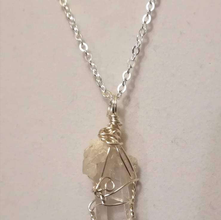 I've handcrafted for you a raw Clear Quartz point gemstone pendant which has been wrapped delicately with silver plated wire.