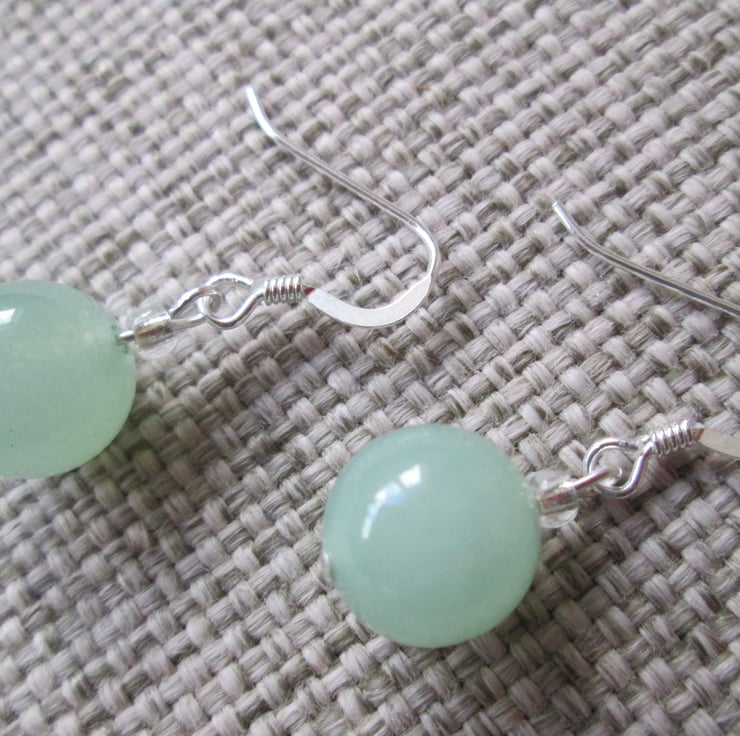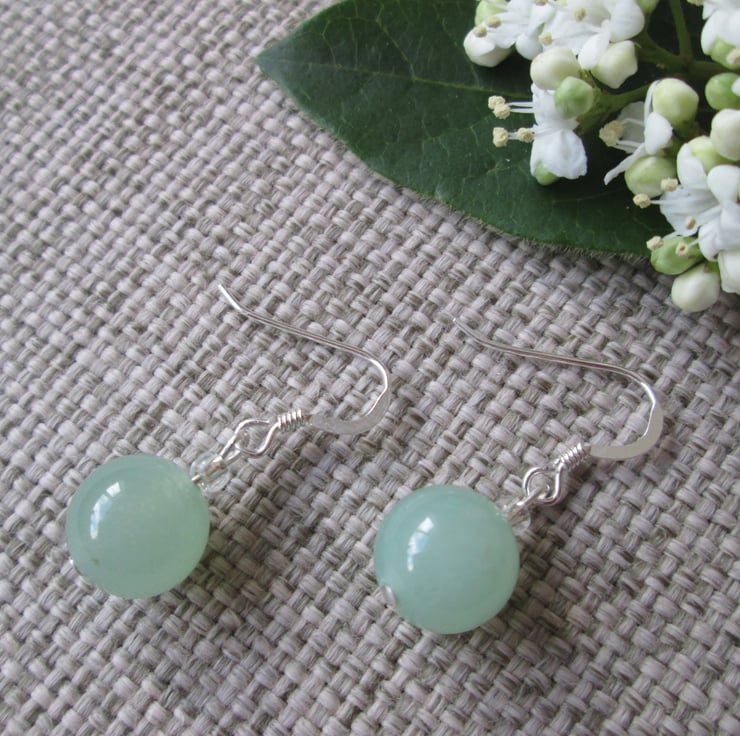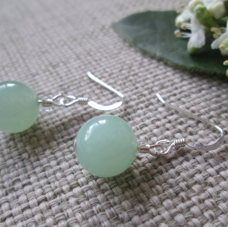 Beautiful earrings made with pale green Quartzite beads on silver-plated earring hooks. The beads are 10mm in diameter and the earrings are approximately 3cm long including the hook. Gorgeous earrings in a beautiful subtle colour.