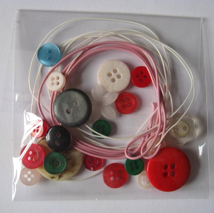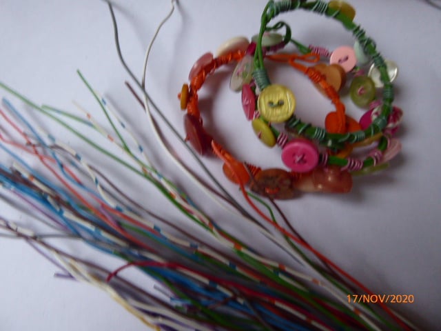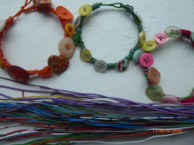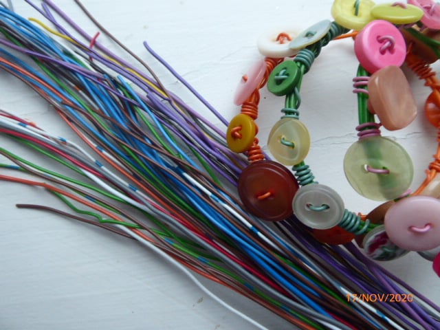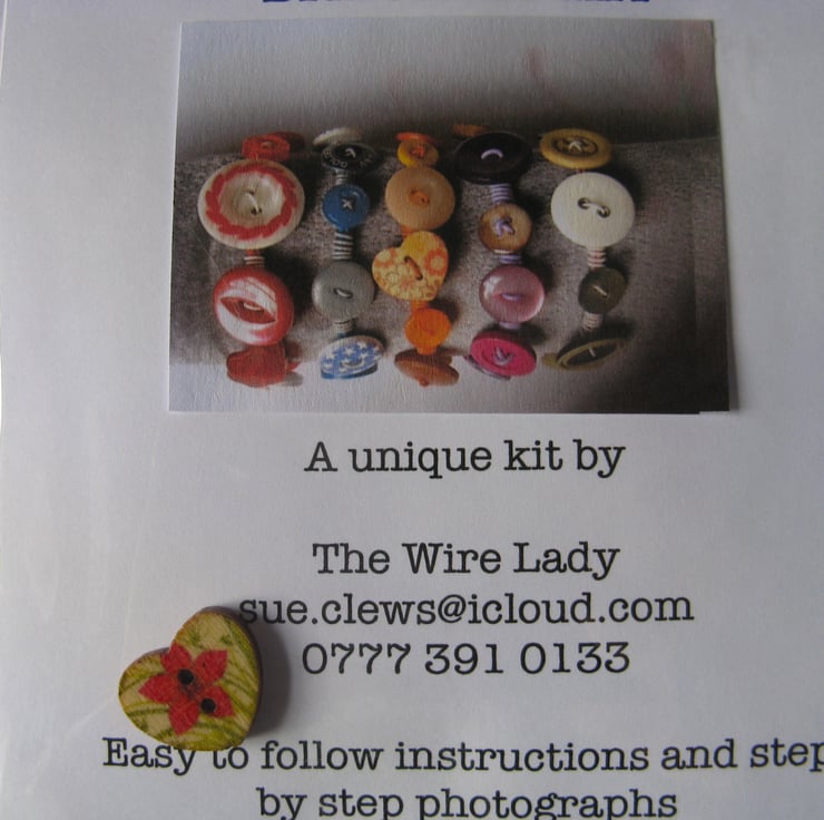 This unique kit designed by The Wire Lady makes a wire wrapped bracelet using plastic coated wires wrapped with novelty buttons. Fastened with an integral wire hook and loop, the bracelet can be adjusted to fit most sizes of adult and child wrists.