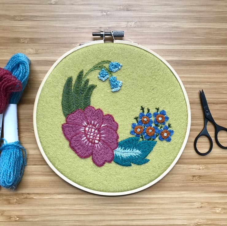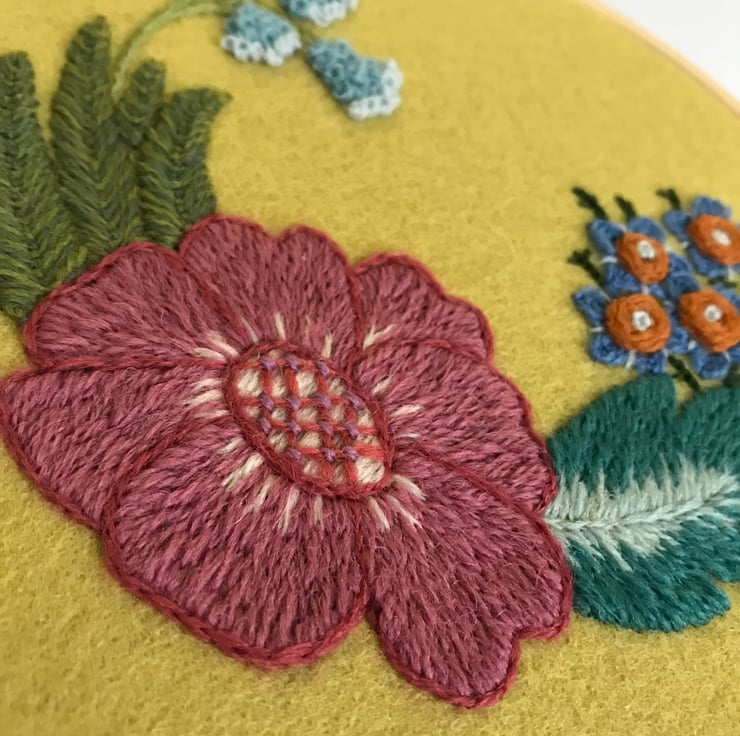 Embroidered flowers in beautiful wool thread on a wool felt background in yellow. Inspired by Jacobean Crewel Embroidery I have designed this piece to use many different stitches to create texture and detail.