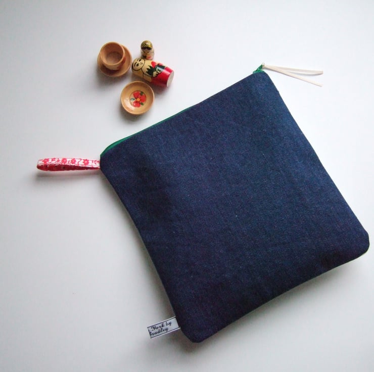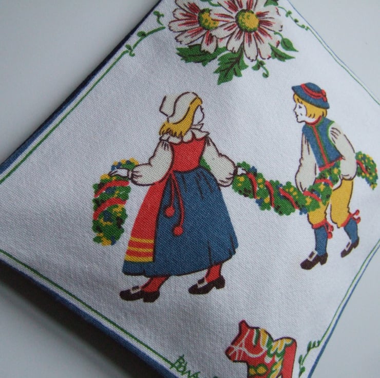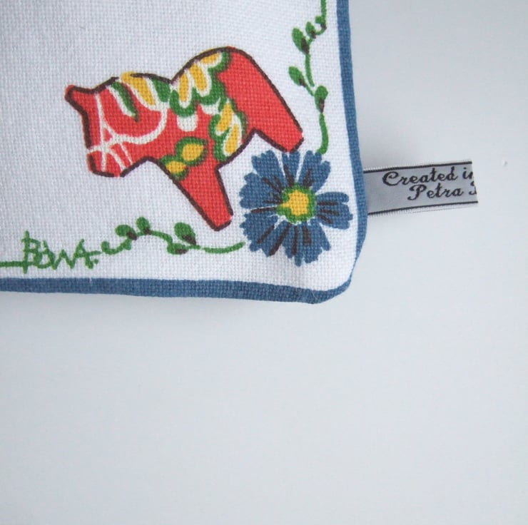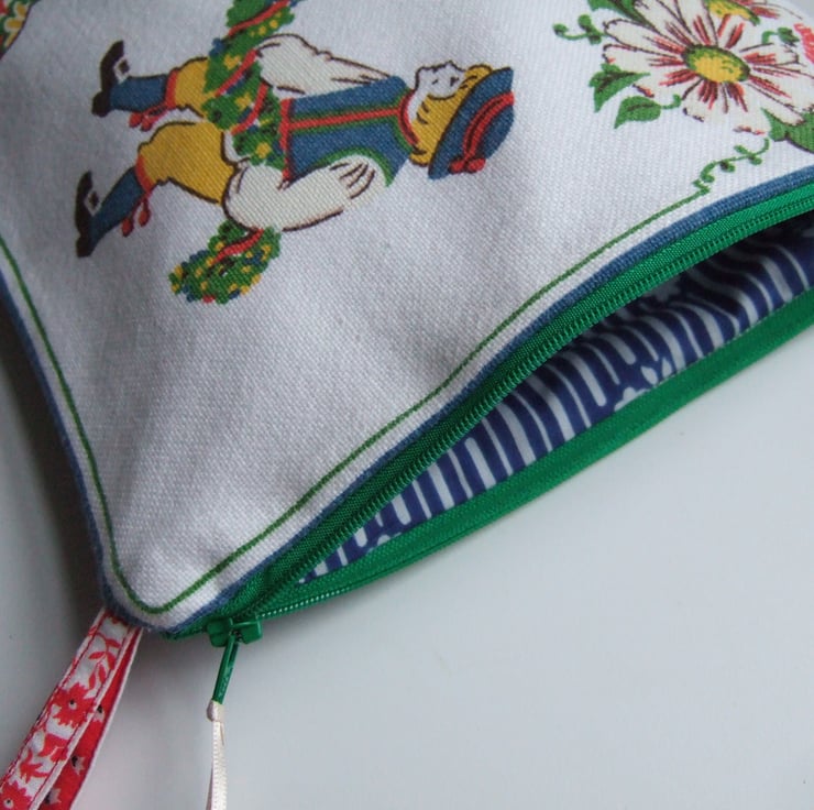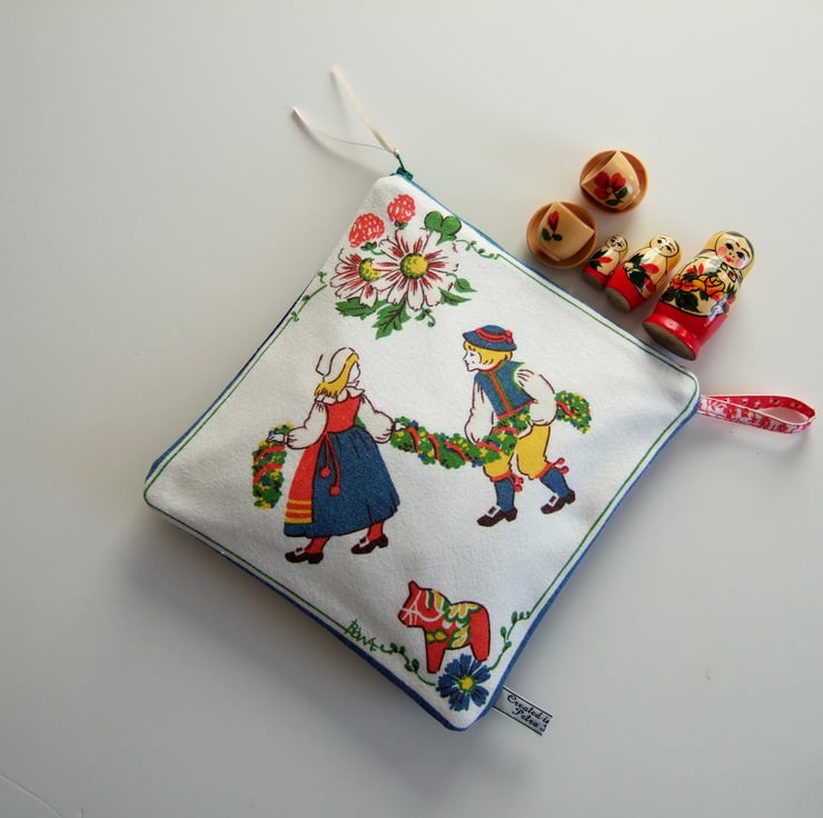 Lovely vintage Swedish table napkin design, made into a practical large pouch, or make up bag. This bright and breezy design by Bowa, shows two children in costume whilst a spring festival is in full swing. Its decorated with strawberries and the famous Dala horse. Perfect for storing precious keepsakes, it would also make a great present for a Scandi lover, or a present for Mother’s Day.