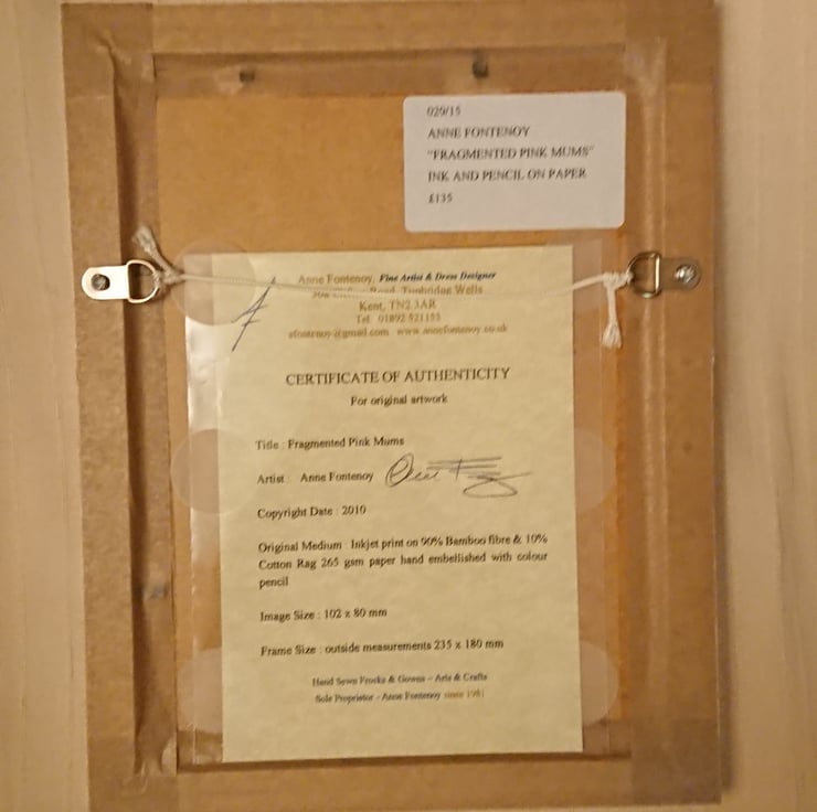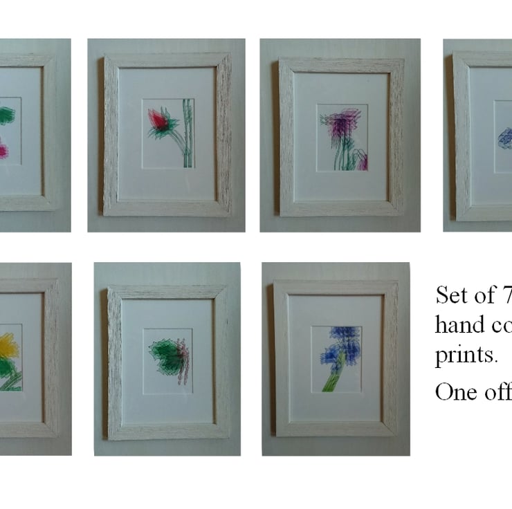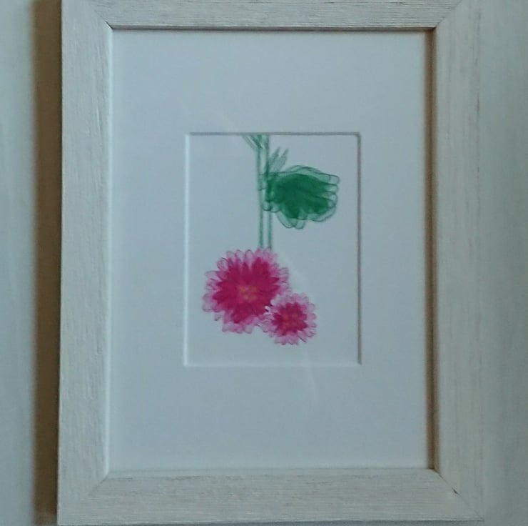 The hand finished flower print measures 8 x 10.5 cm printed onto Hahnemuehle 90% bamboo fibre and 10% cotton rag fine art paper which I embellished with colour pencils. The off-white distressed look wooden frames 155 x 204 mm (6 x 8 in) into the rebate of the frame which has acrylic glazing and the image is surrounded by an off-white mount. There are d-rings and cord attached of the back of the picture so that it is ready to hang.