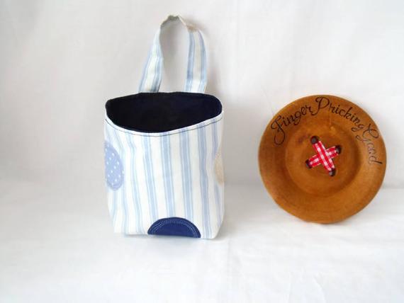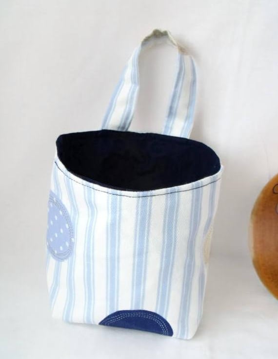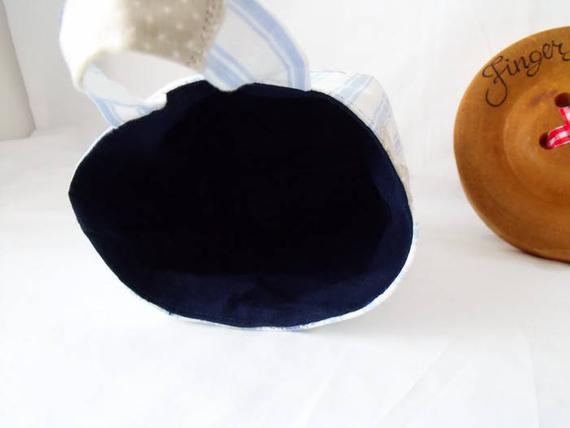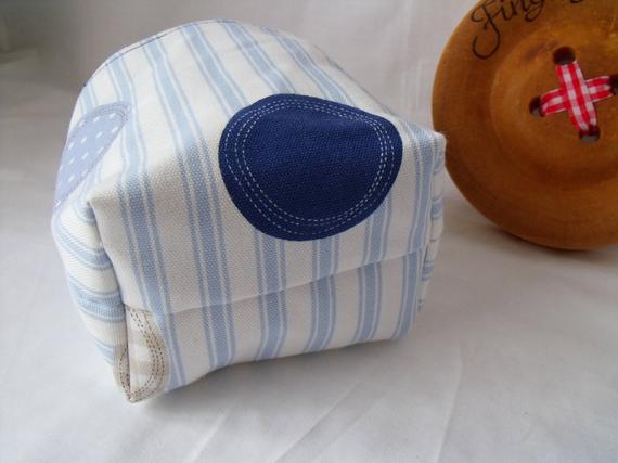 Sewn with blue striped upholstery weight cotton fabric which I've sewn onto buckram which is a heavy weight interfacing to maintain the structure.