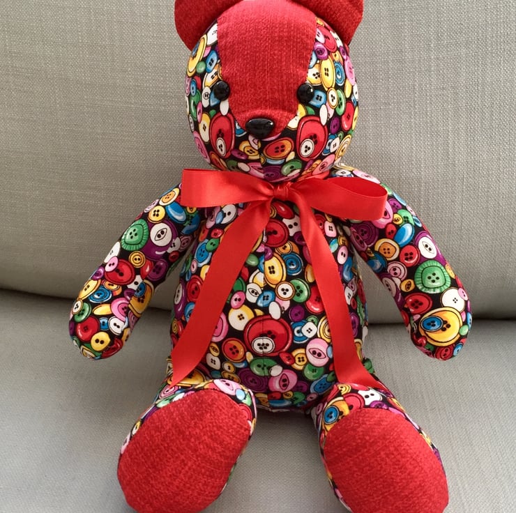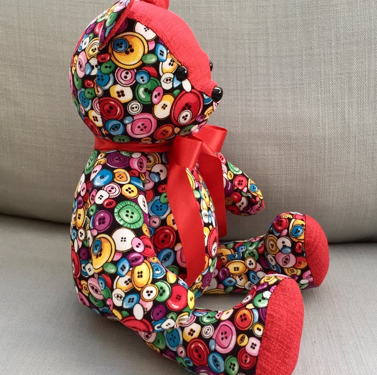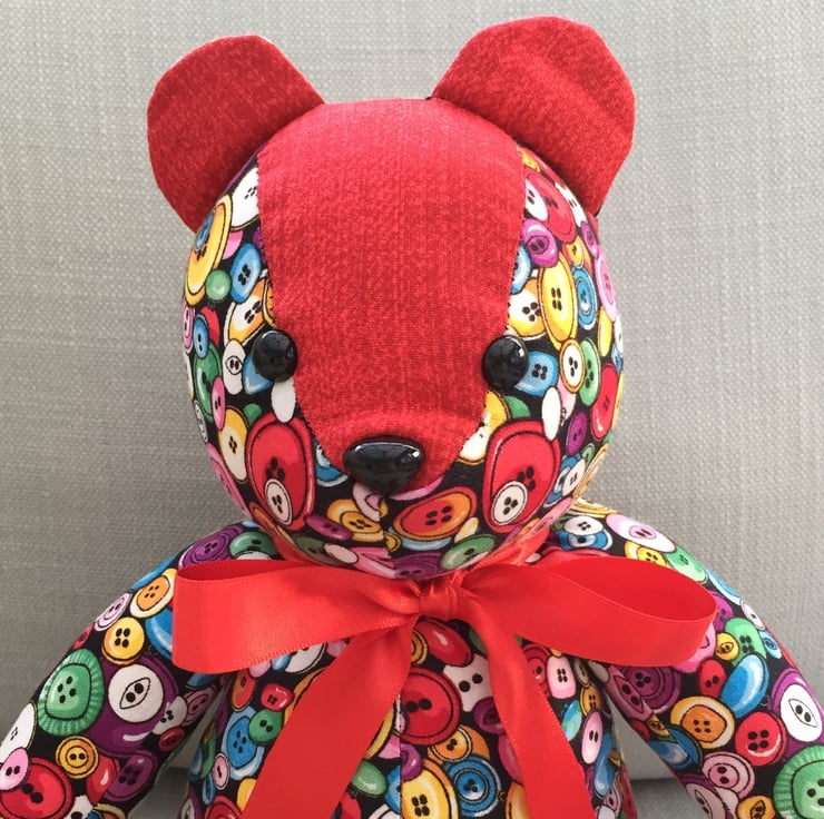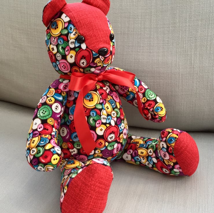 This small teddy bear is made from cotton fabric which has a colourful button design.