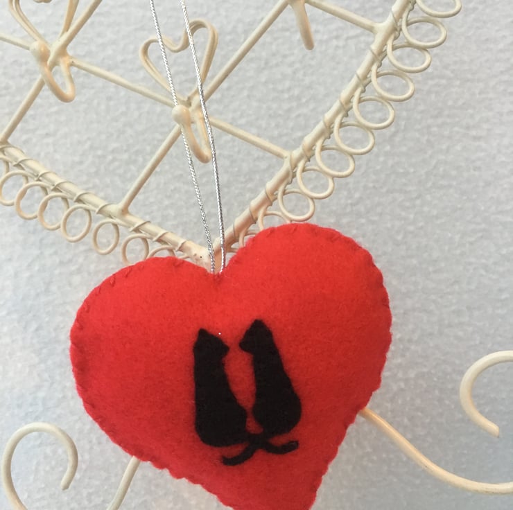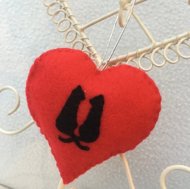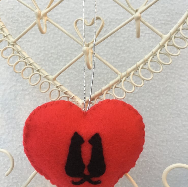 A lovely silhouette of two Black Cat’s hand stitched on to a Red felt heart ONE Supplied.