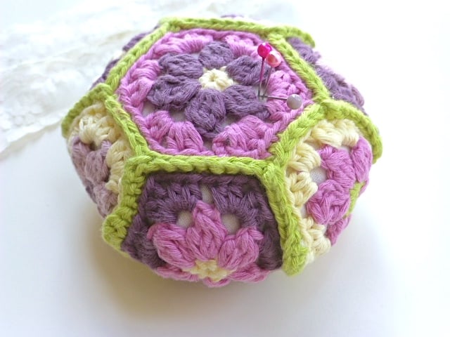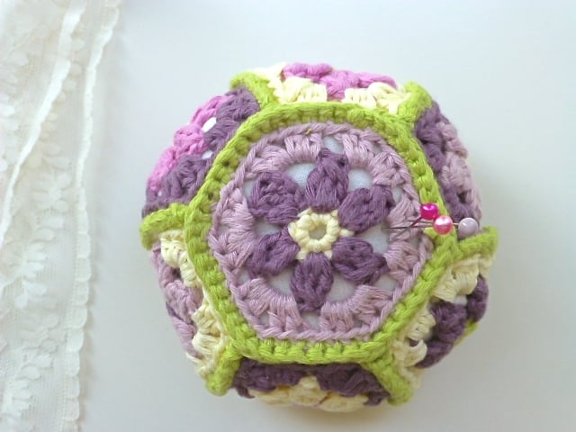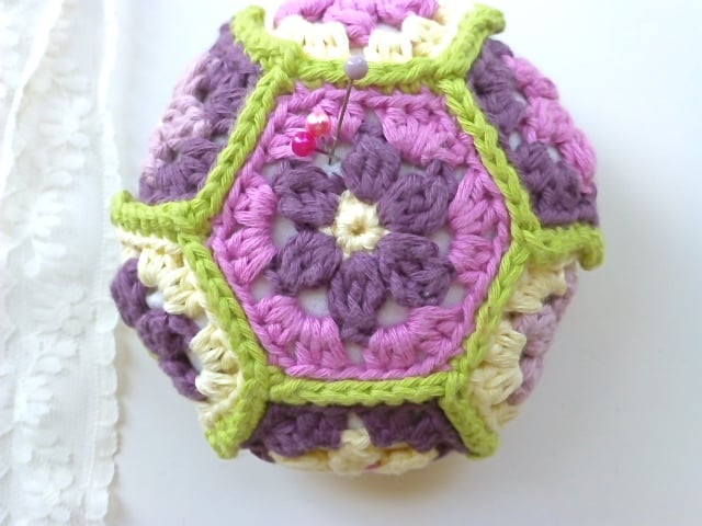 This unusual, hexagon pincushion has central flower motifs edged with a contrasting colour. The eight individual hexagons are joined with green. The colours range from the yellow to pink, mauve and purple. The perfect colours for spring.