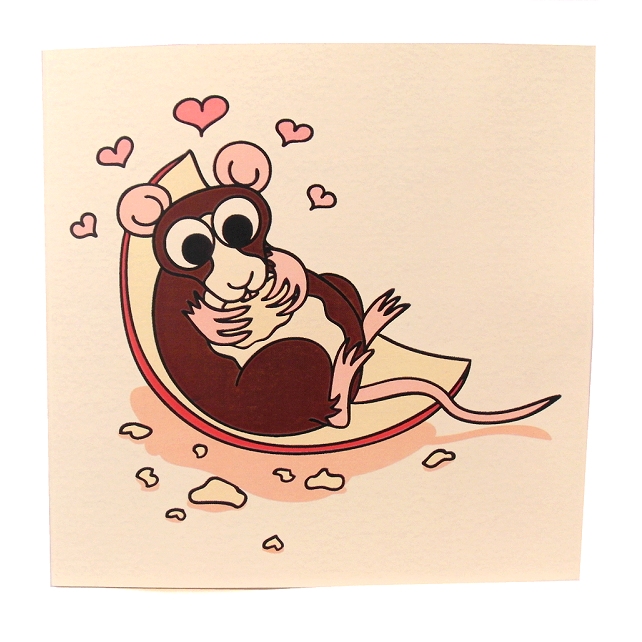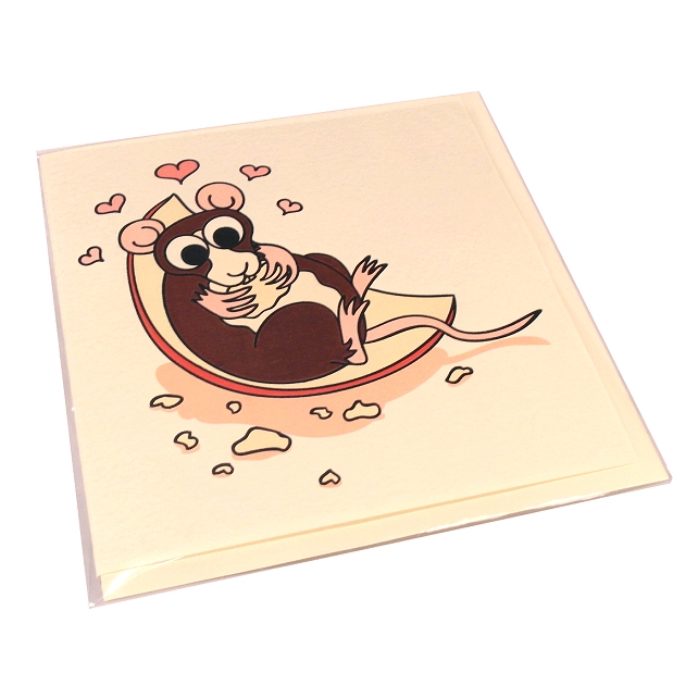 This original cartoon rat design by Kim Onyskiw is printed on a 15cm x 15cm (6" x 6") square ivory card, and comes with an ivory envelope.