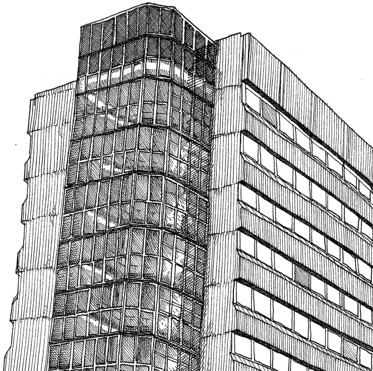 This is a reproduction of a drawing I did of Merrion House, a brutalist office block that has since been renovated so much that it is unrecognisable to this. This original A4 drawing was done by myself, Leeds based illustrator Simon Lewis, in 2012.