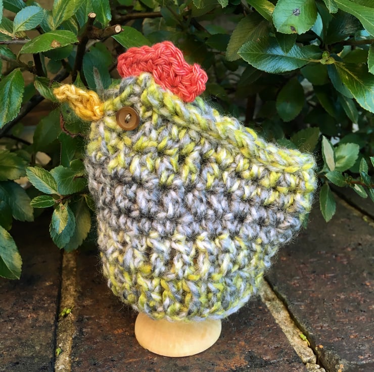 Made with marbled chunky yarn in shades of grey and lime green with a coral pink comb and golden yellow beak. There are two brown buttons sewn on for eyes.