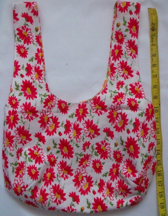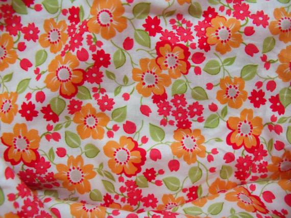 Sewn with Moda fabric, one side is red flowers, the other is orange and red flowers.