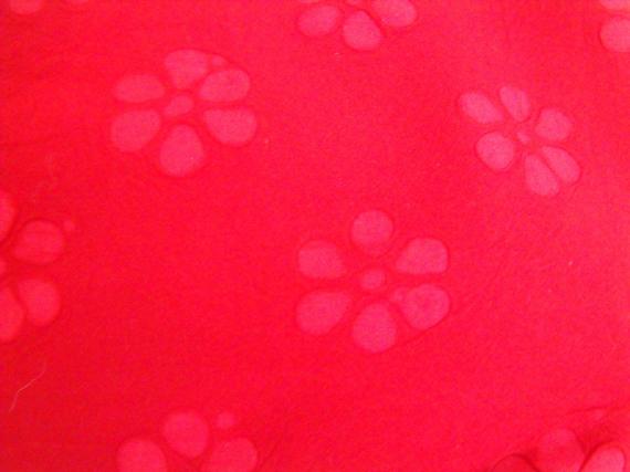 Deep red daisy pattern in relief on one side and coordinating red and white rose pattern on the other.