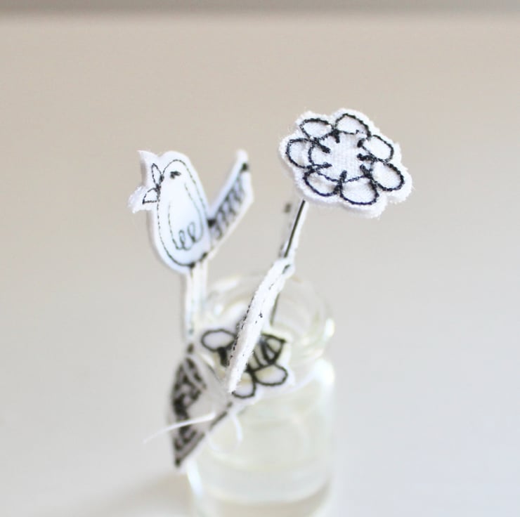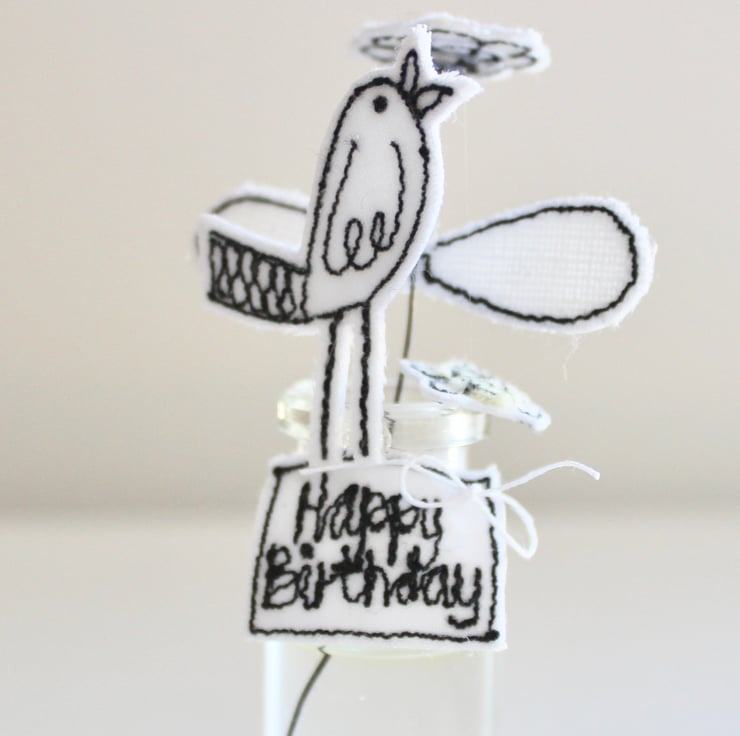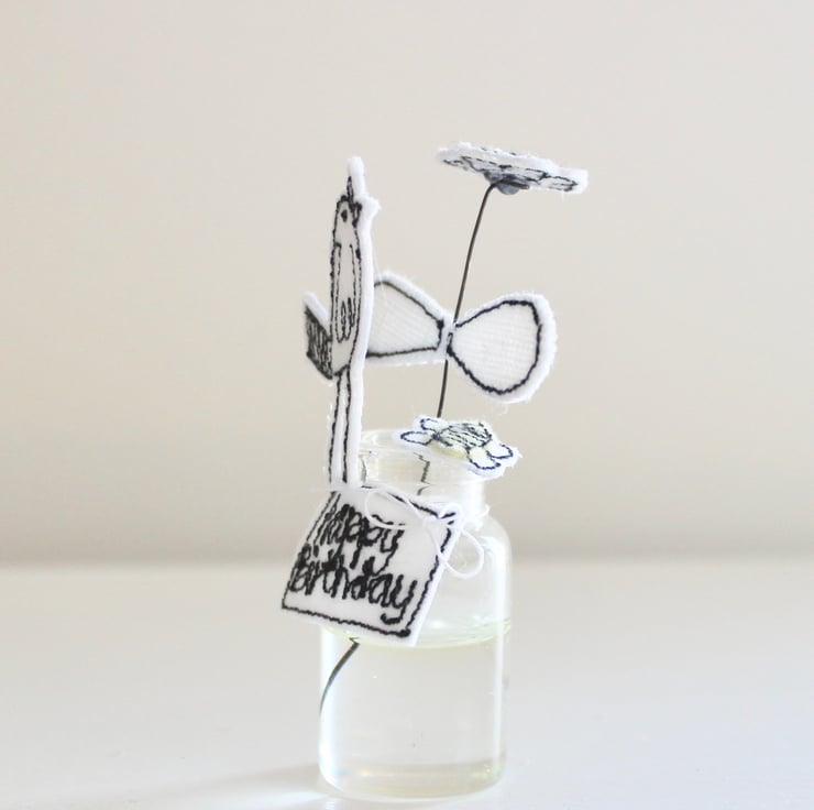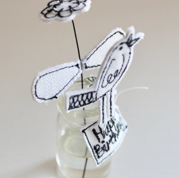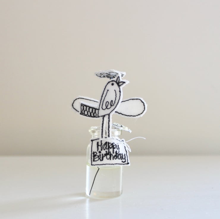 The flower and leaves are created using fabric and free hand machine embroidery with a wire stem holding them in position in acrylic water. Sitting next to the flower is a fabric birdie and bee and around the bottle neck hangs a sewn fabric label saying 'Happy Birthday'.